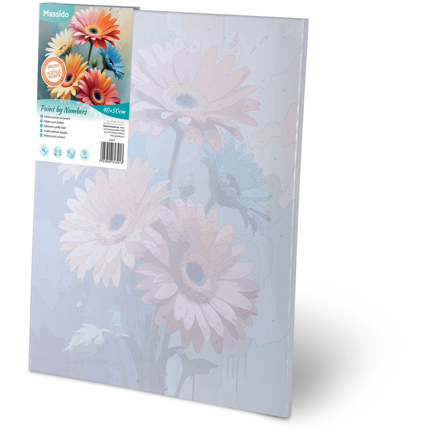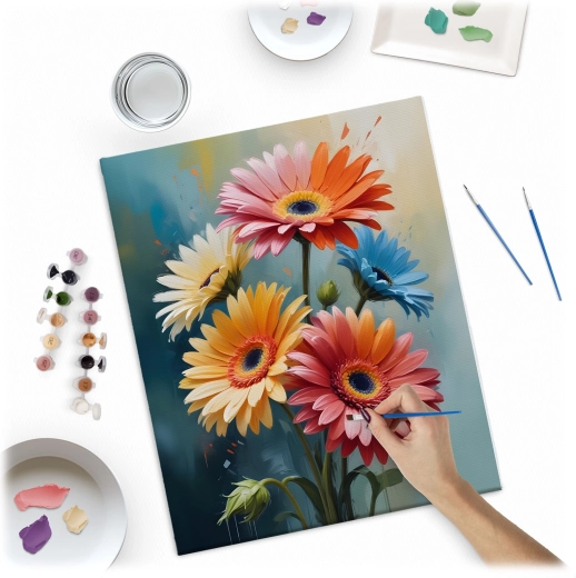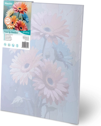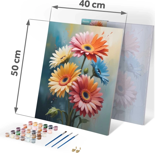 Alapozott, 40 × 50 cm-es keretes vászon, akár 30 élénk akrilfesték és három ecset (1 mm, 2 mm, 7 mm) a részletekhez és a nagyobb felületekhez – azonnal kezdheti a festést.