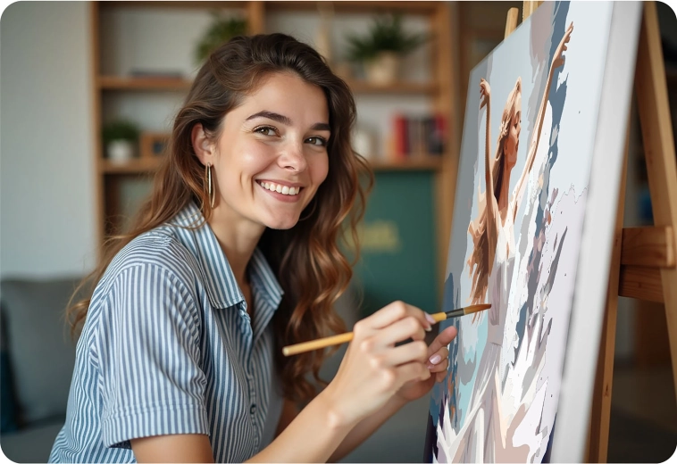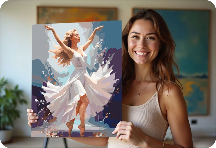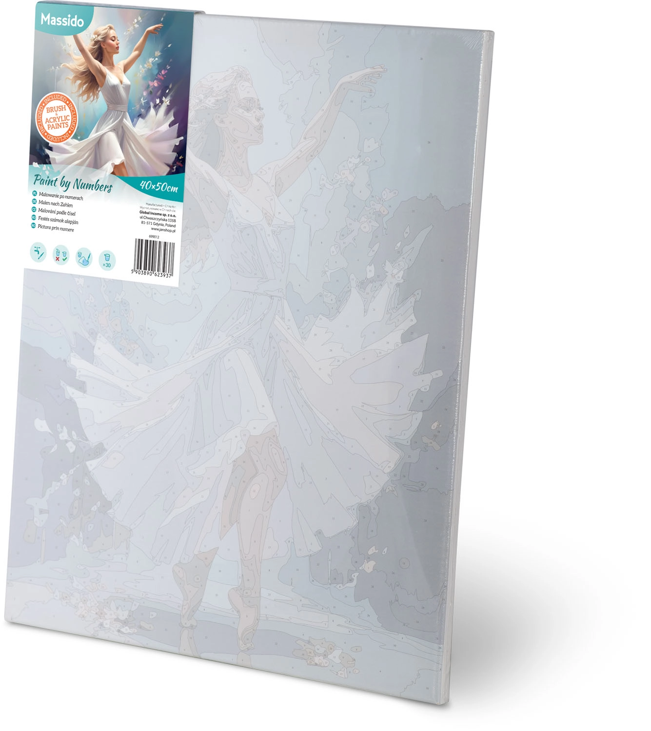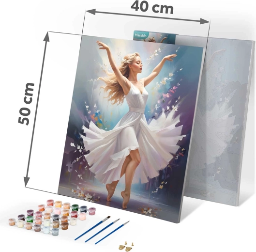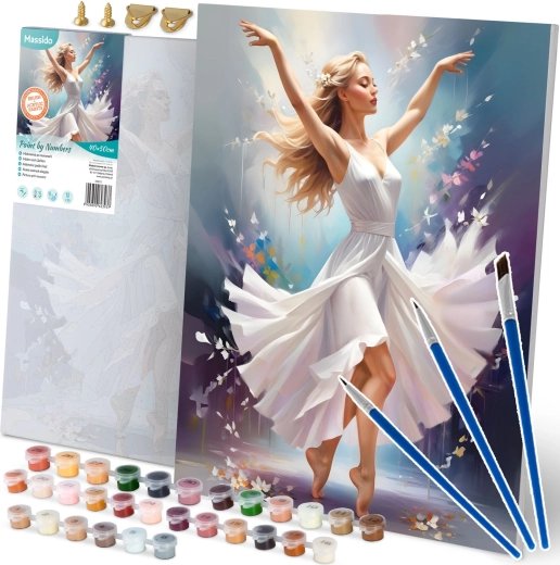 Változtassa a szabadidejét kreatív élménnyé. A MASSIDO szett Táncoló nő motívummal mindent tartalmaz egy elegáns festmény elkészítéséhez: keretre feszített, számozott zónákkal ellátott vásznat, akár 30 élénk akrilfestéket és három precíz ecsetet. A színes alapozásnak és az egyértelmű jelöléseknek köszönhetően a festés intuitív és pihentető, gyerekeknek és felnőtteknek egyaránt ideális.
