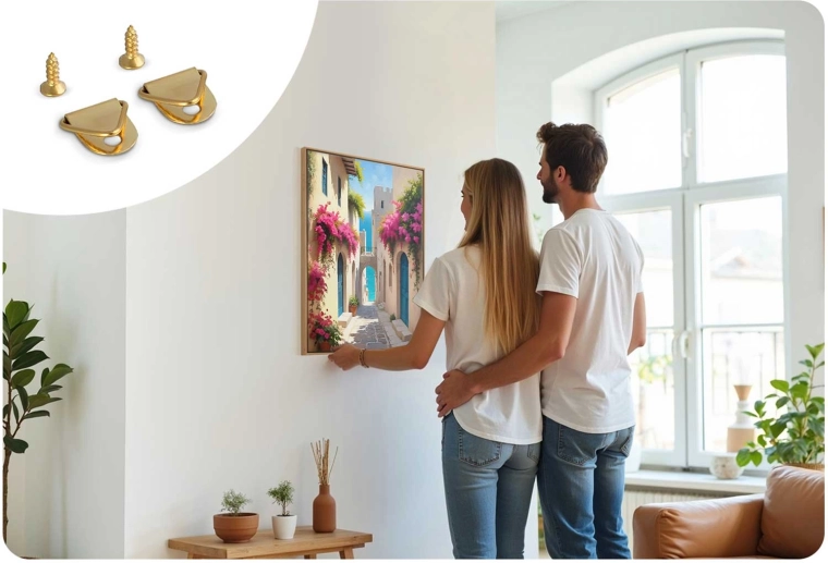 A csomag tartalmazza a függesztő hardvert is, így a kép száradás után egyszerűen felakasztható, és azonnal egyedi karaktert ad a belső térnek.