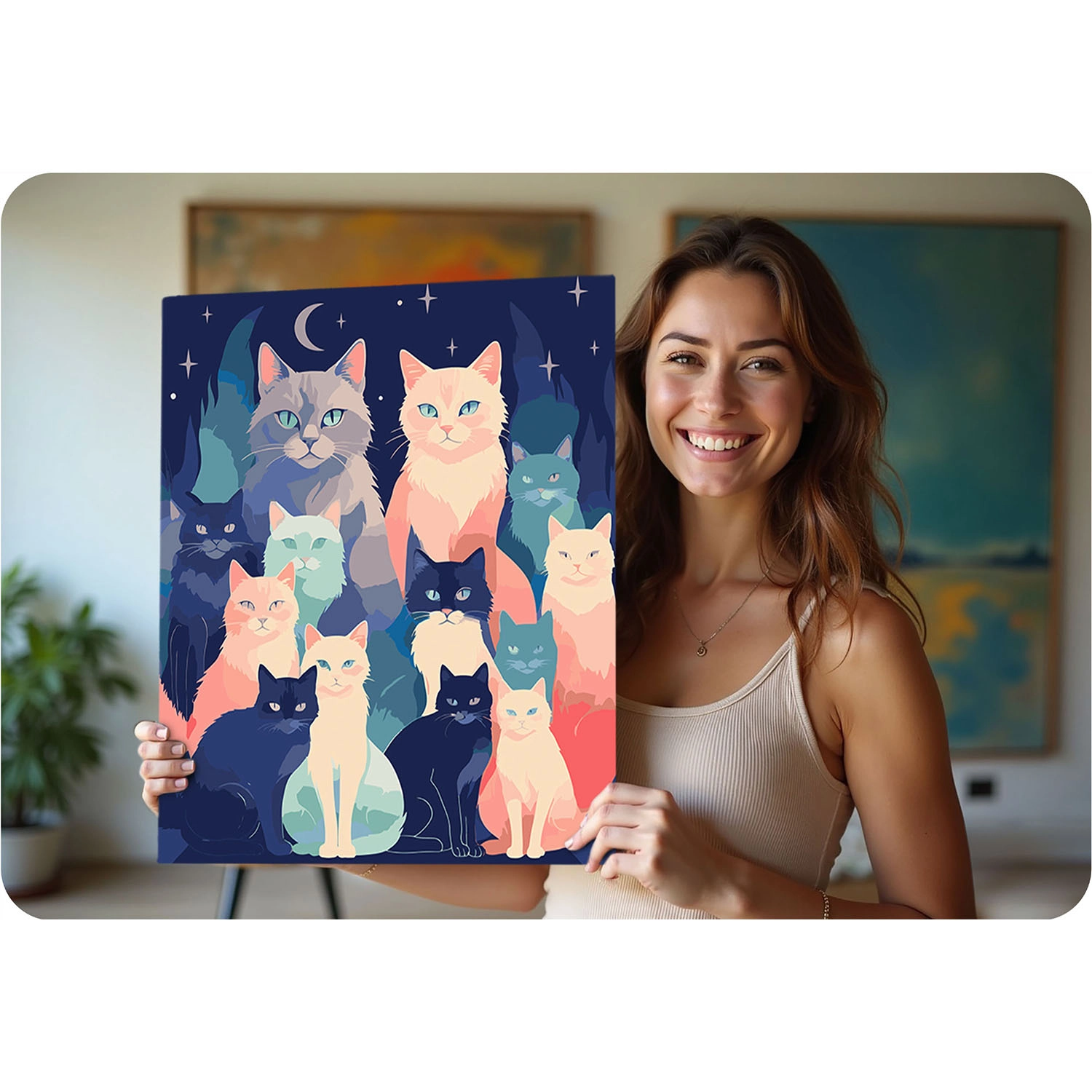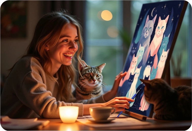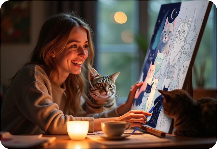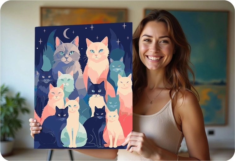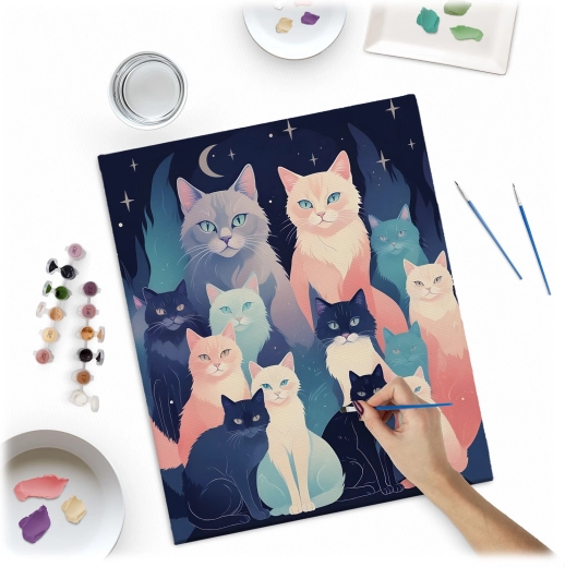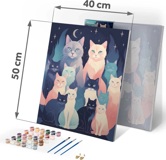 Engedje el a gondolatokat, és merüljön el a színek világában. A Massido készlet mindent tartalmaz, amire szüksége van: minőségi, fa keretre feszített vászon, áttekinthetően számozott felületek, élénk, jól fedő akrilfestékek és precíz ecsetek. Az eredmény egy életteli macskás kép sötétkék háttéren, amely otthonát díszíti vagy ajándékként is örömet szerez.