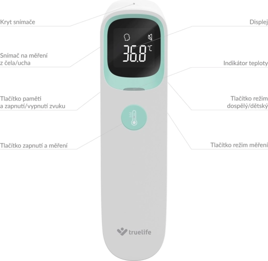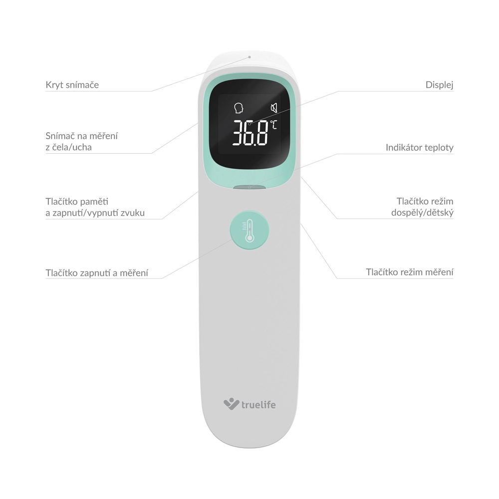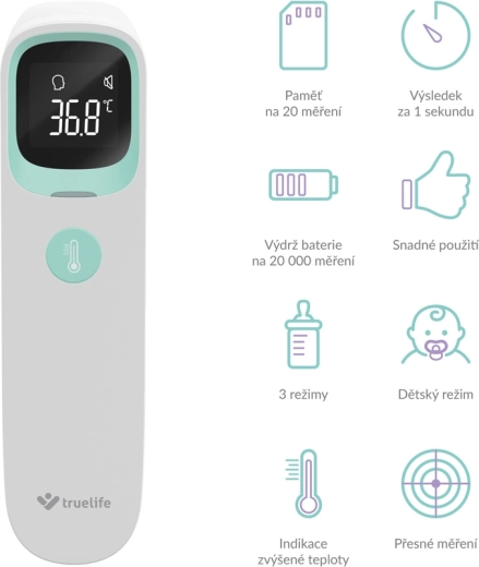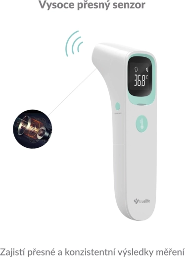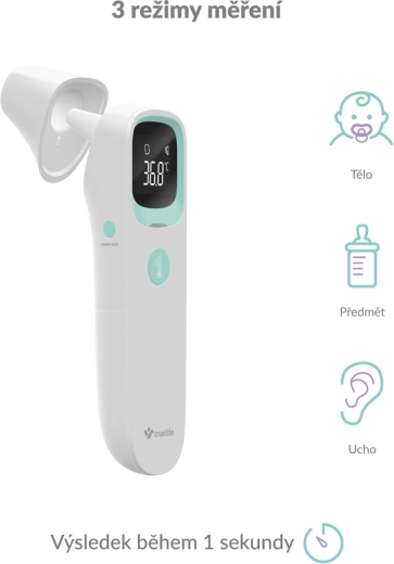 A TRUELIFE Care Q9 modern, érintés nélküli infravörös hőmérő, amely 1 másodperc alatt méri a hőmérsékletet nagy pontossággal. A három üzemmódnak köszönhetően alkalmas a testhőmérséklet mérésére homlokról és fülből, valamint tárgyak és folyadékok hőmérsékletének ellenőrzésére – ideális anyatejhez/tápszerhez, fürdővízhez vagy italokhoz. A kijelzőn a színes jelző azonnal figyelmeztet a megemelkedett hőmérsékletre, sötétben is.
