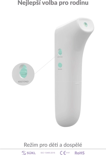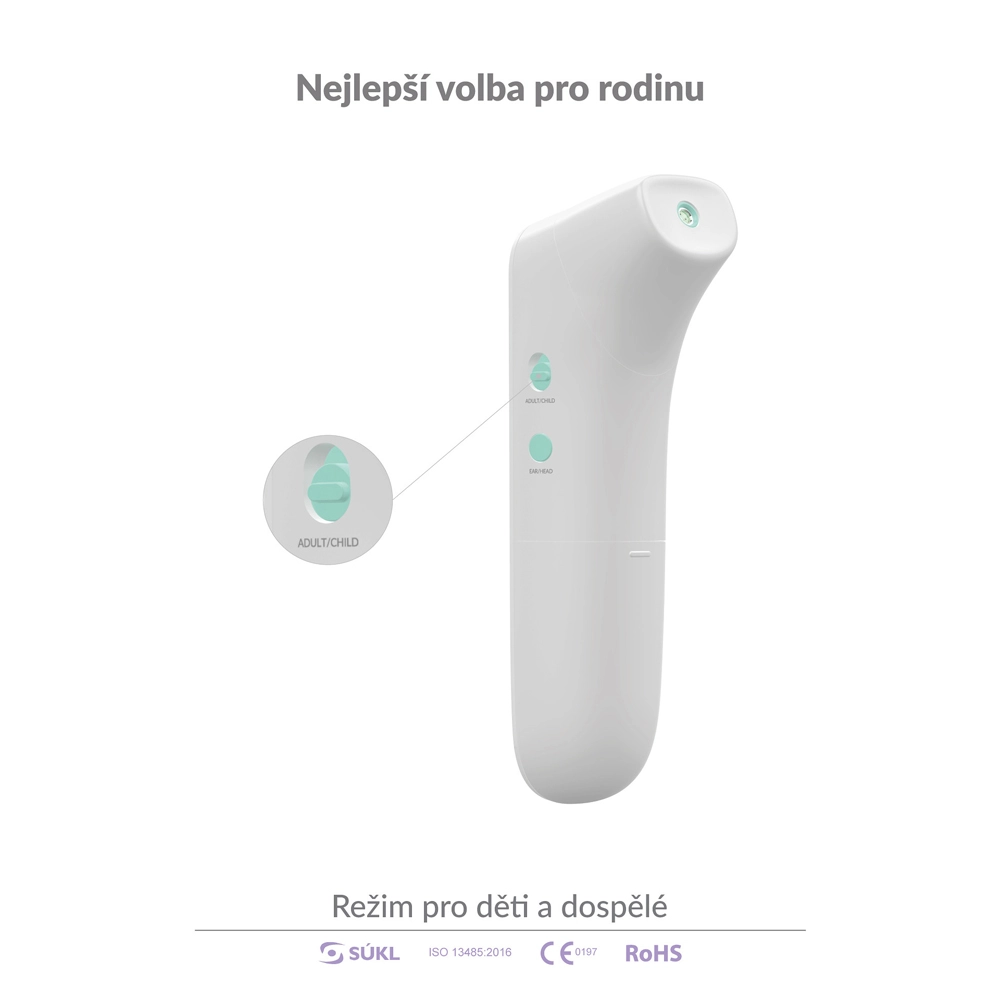 Családok számára gyermek üzemmód is elérhető 12 év alattiakhoz. A mérés teljesen higiénikus és kényelmes – elég 1–3 cm távolságból célozni, majd megnyomni az egyetlen gombot. A hőmérő az utolsó 20 értéket eltárolja, és takarékos működésével egy szett elemmel akár 20 000 mérést is elvégez.