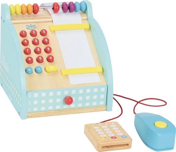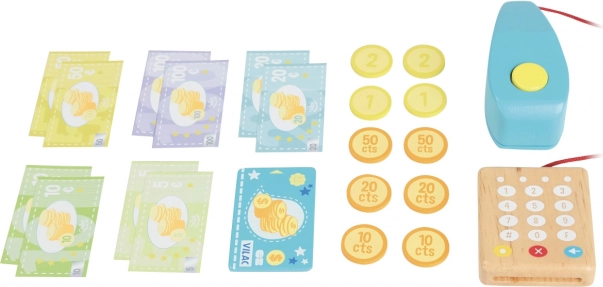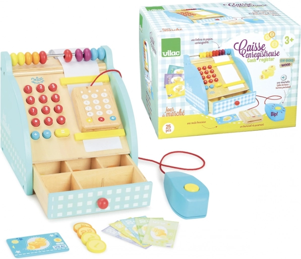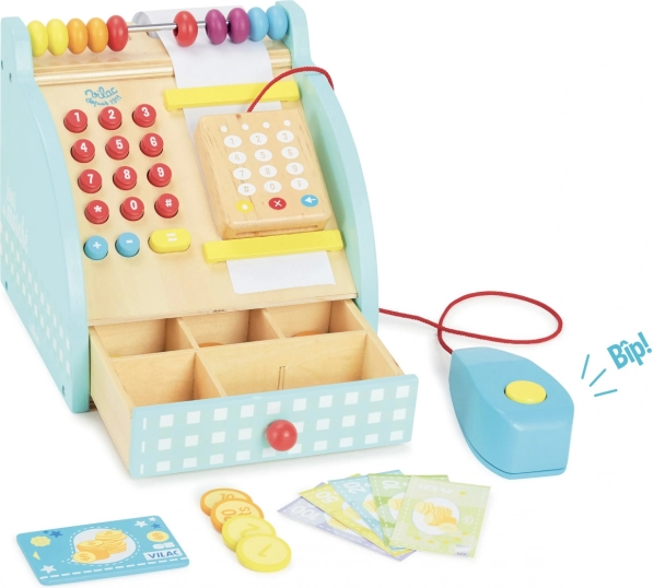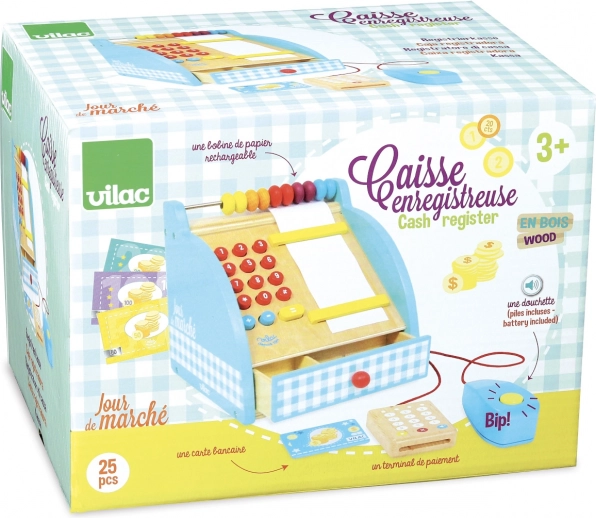 A stílusos VILAC fa pénztárgép örömet szerez a kis eladóknak. Funkcionális numerikus billentyűzettel, pénzfiókkal, számlálóval és bankkártya-terminállal rendelkezik. A készlet része továbbá bankjegyek és érmék, valamint egy klasszikus hangjelző gomb, amely még élethűbbé teszi a játékot.