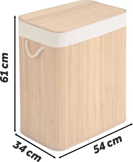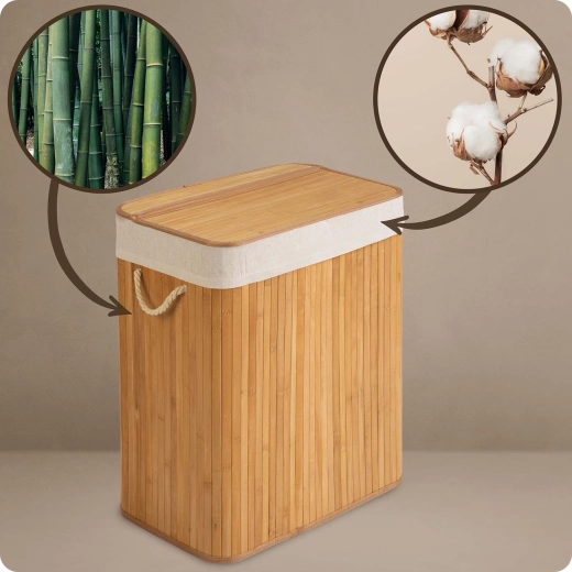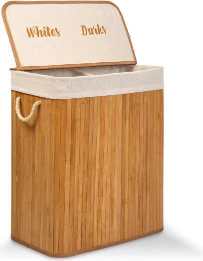 A természetes bambuszból készült, kétrekeszes szennyeskosár megkönnyíti a mindennapi válogatást – a ruhákat már betételkor különítheted a Lights és Darks jelölésű részekbe. A nagy, 100 l-es kapacitásnak köszönhetően több mosásnyi ruhát is elnyel, és rendet, tisztaságot tart a fürdőben vagy a hálóban.