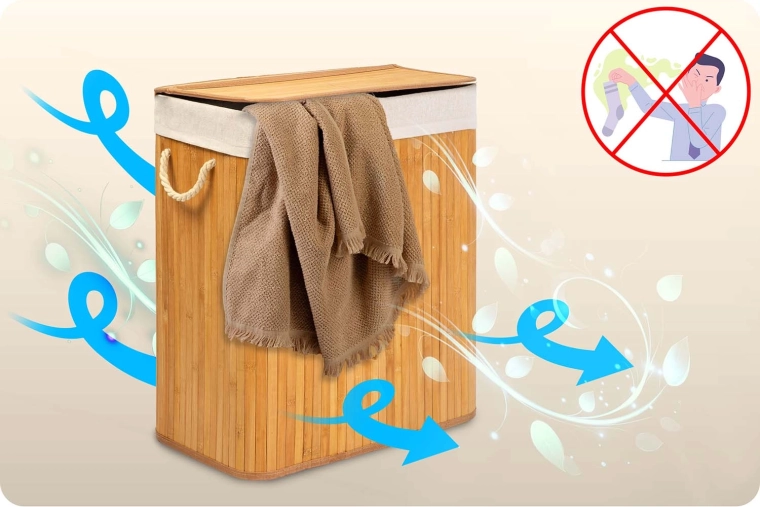A természetes anyagok – bambusz és pamut – támogatják a légáteresztést, segítenek csökkenteni a nedvességet és a szagokat. A kivehető pamutzsákot könnyen kiveheted, összehúzhatod a zsinórral, és egyből a mosógéphez viheted. A praktikus fedél, az erős kötél fogók és a stabil alj hosszú élettartamot és egyszerű kezelhetőséget biztosítanak.