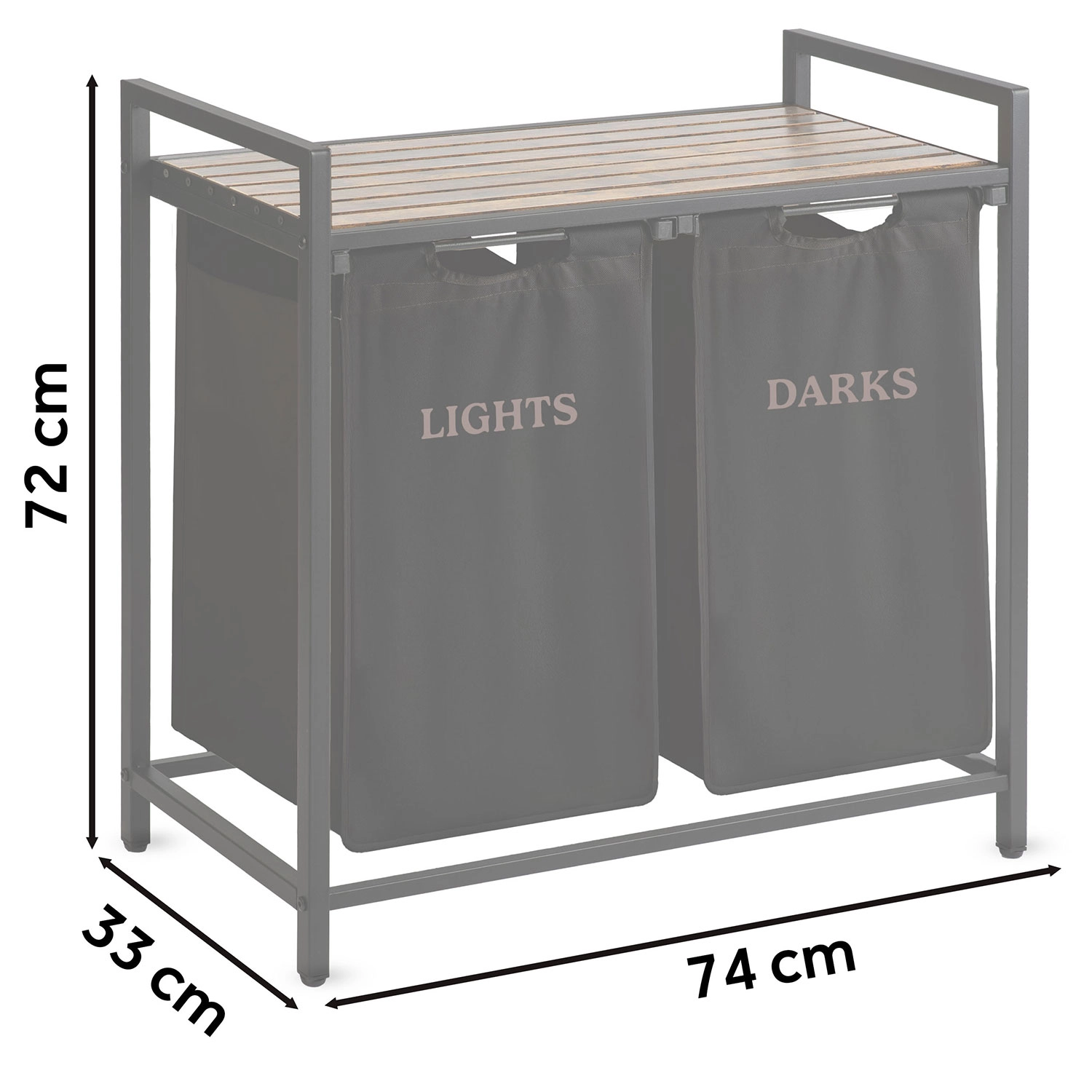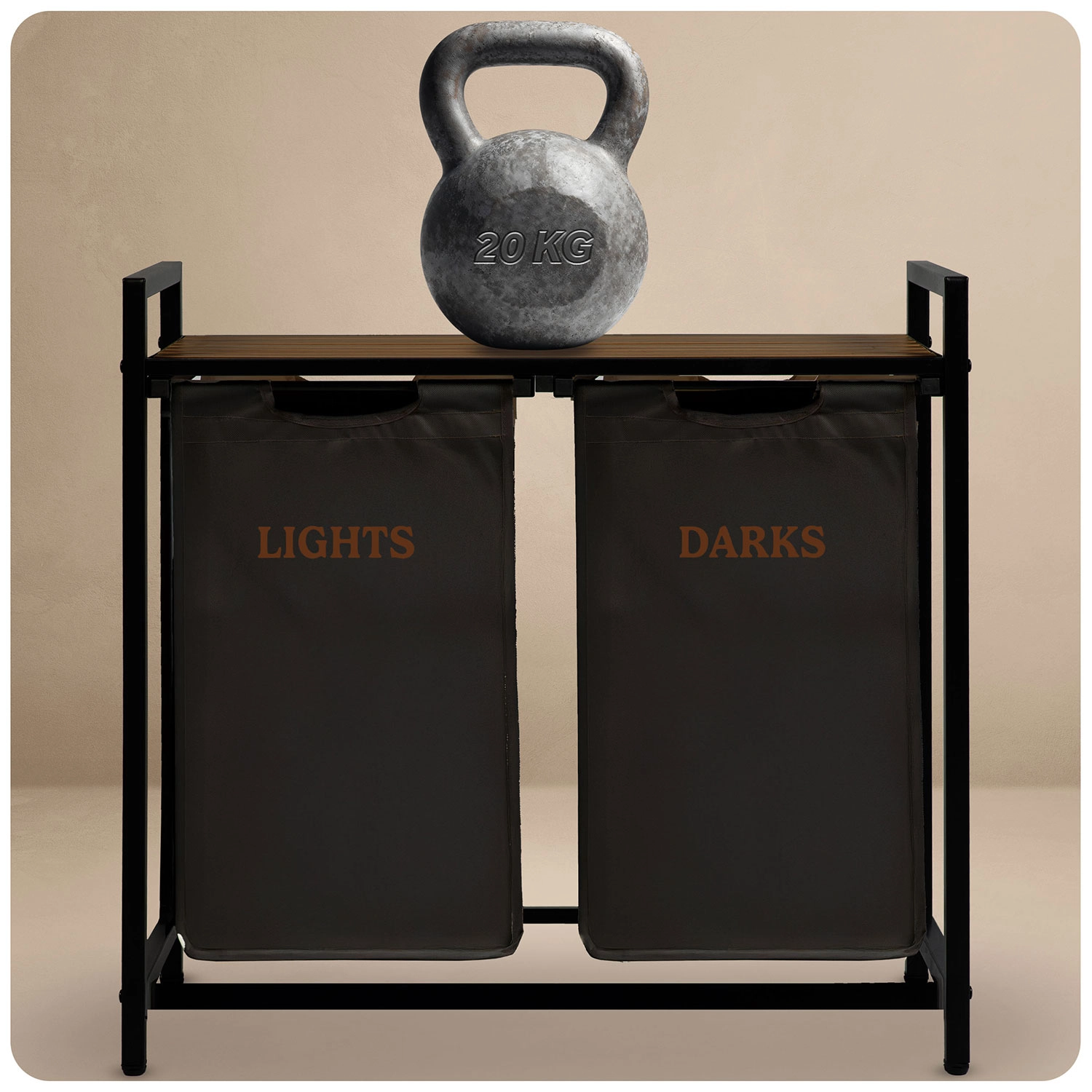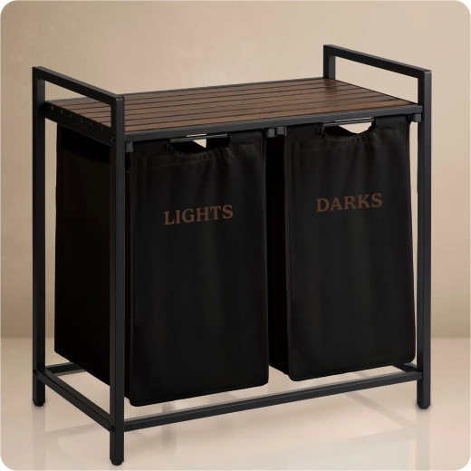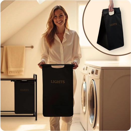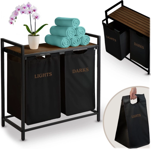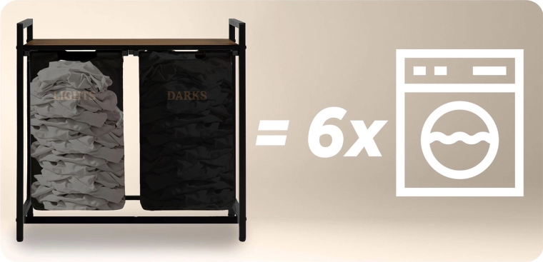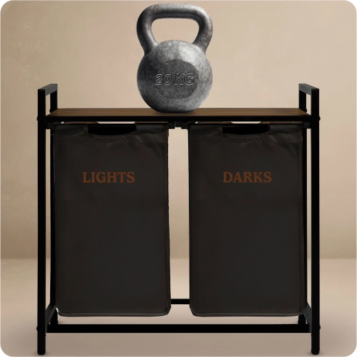 A két, „Lights” és „Darks” feliratú textilkosárnak köszönhetően már a lerakáskor szétválogathatja a ruhákat – nincs többé hosszas osztályozás mosás előtt. A természetes fából készült felső polc helyet kínál a mosószereknek, törölközős kosaraknak vagy kisebb készülékeknek, és akár 20 kg-ot is elbír.