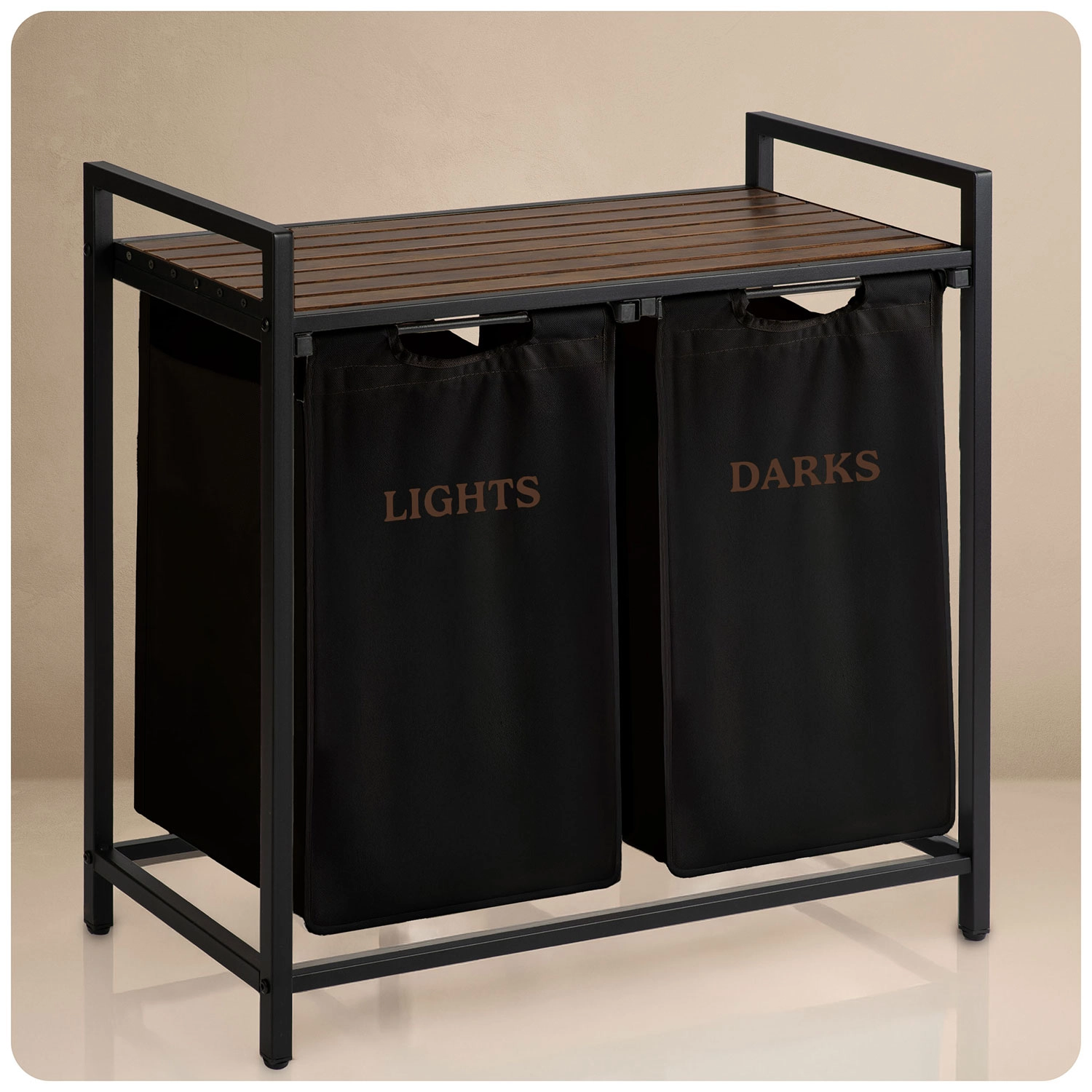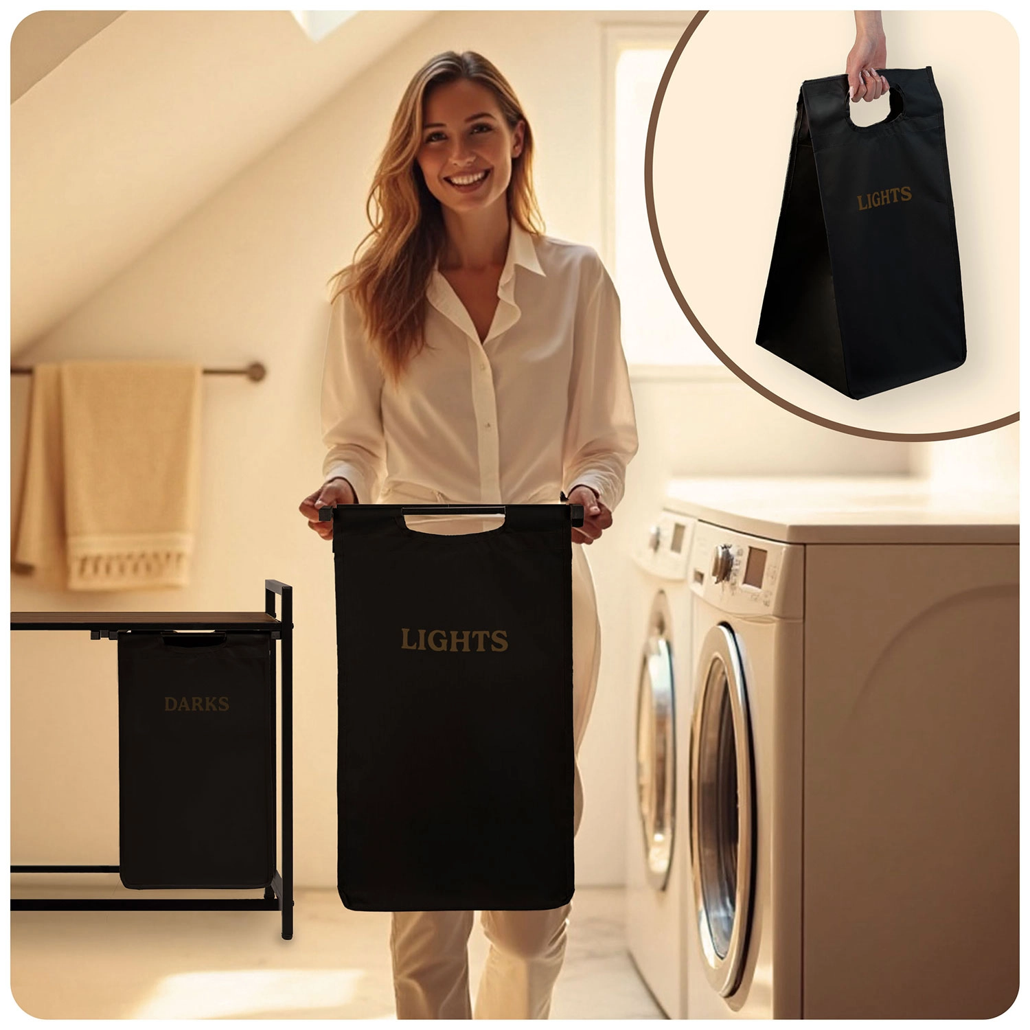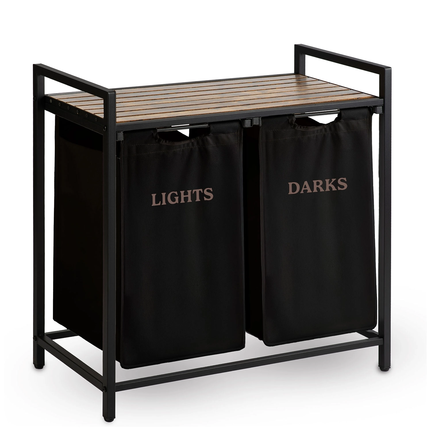 A két, „Lights” és „Darks” feliratú textilkosárnak köszönhetően már a lerakáskor szétválogathatja a ruhákat – nincs többé hosszas osztályozás mosás előtt. A természetes fából készült felső polc helyet kínál a mosószereknek, törölközős kosaraknak vagy kisebb készülékeknek, és akár 20 kg-ot is elbír.