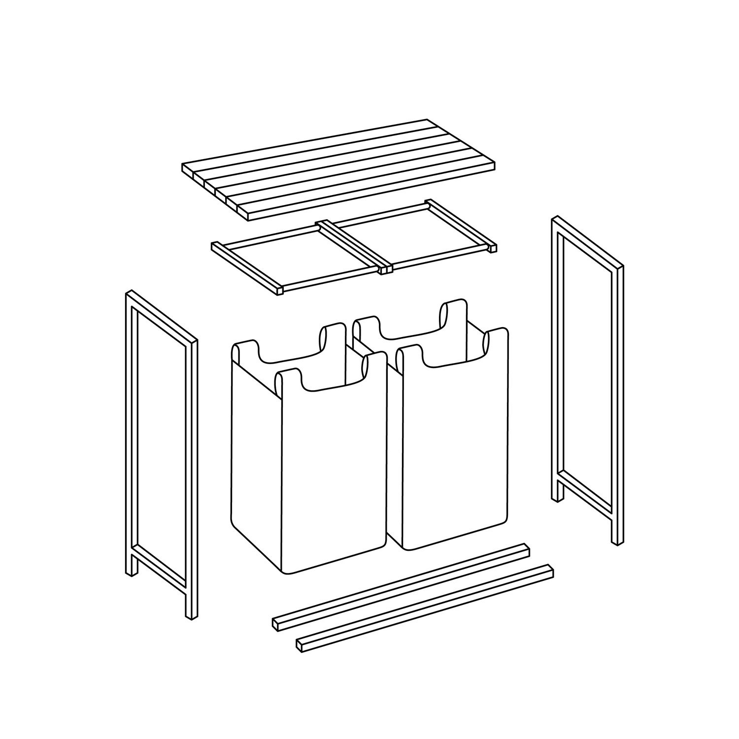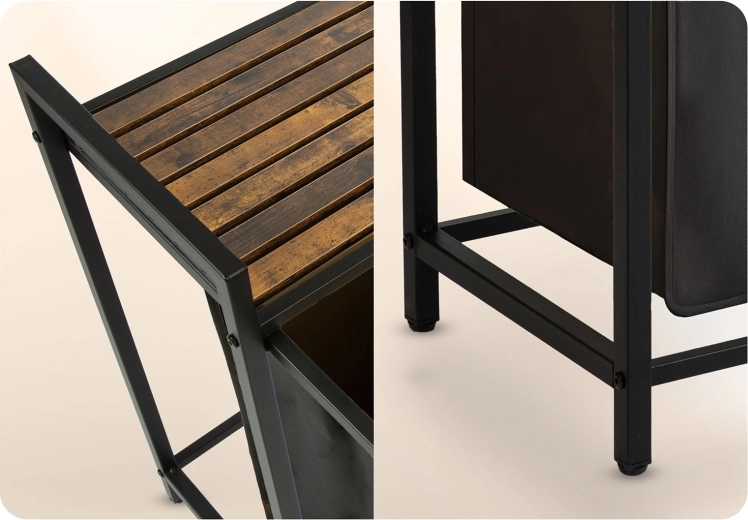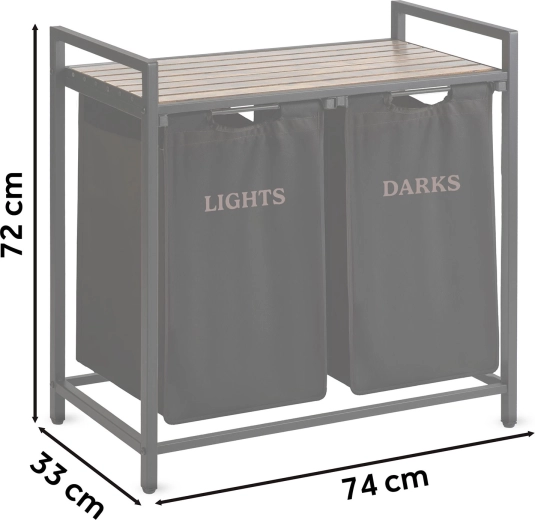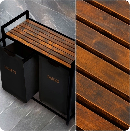 A porszórt acél váz korrózió-, karc- és kopásálló, a fa lap pedig páratűrő és penészálló. A kivehető betétek praktikus fogantyúkkal a kosarat hordozható zsákká alakítják – egyszerűen kiveszi és a mosógéphez viszi, rendetlenség nélkül.
