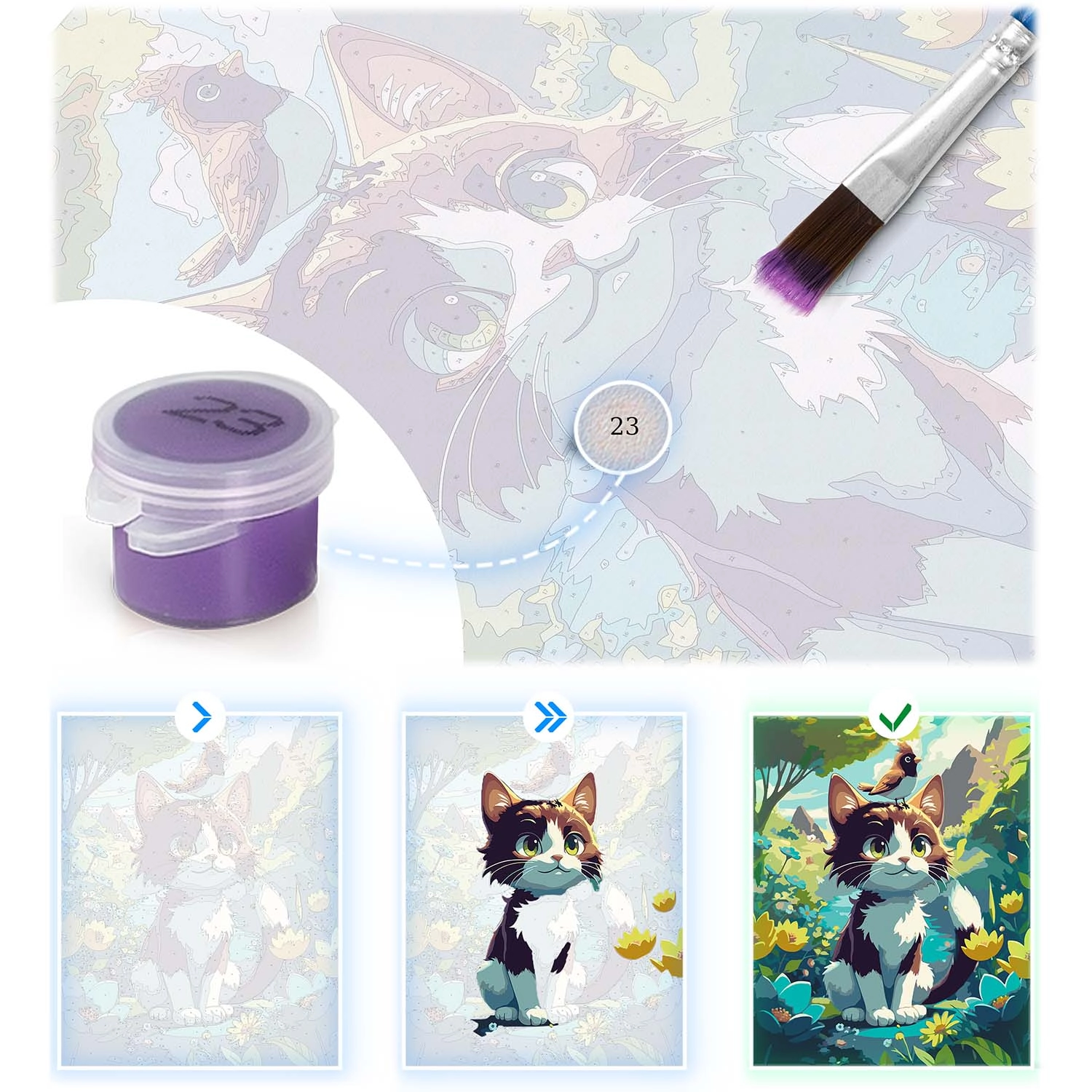 Alkossa meg saját színes cicaképét, és élvezze a pihentető, kreatív élményt. A fa keretre feszített vászon (blindkeret) festésre kész, a finoman tónusozott aláfestés megkönnyíti a határok lefedését, és segít a tiszta végeredményben. A telt, jól pigmentált festékek kellemes állagúak, nem szükséges hígítani.