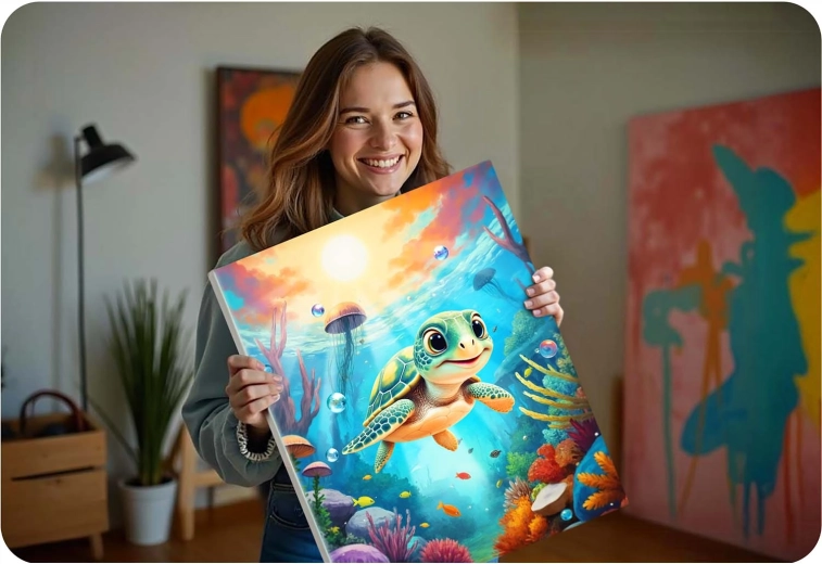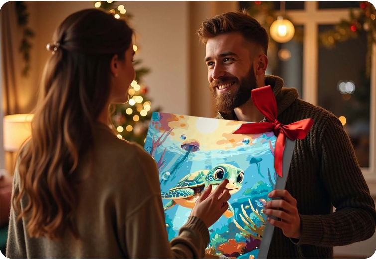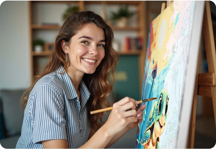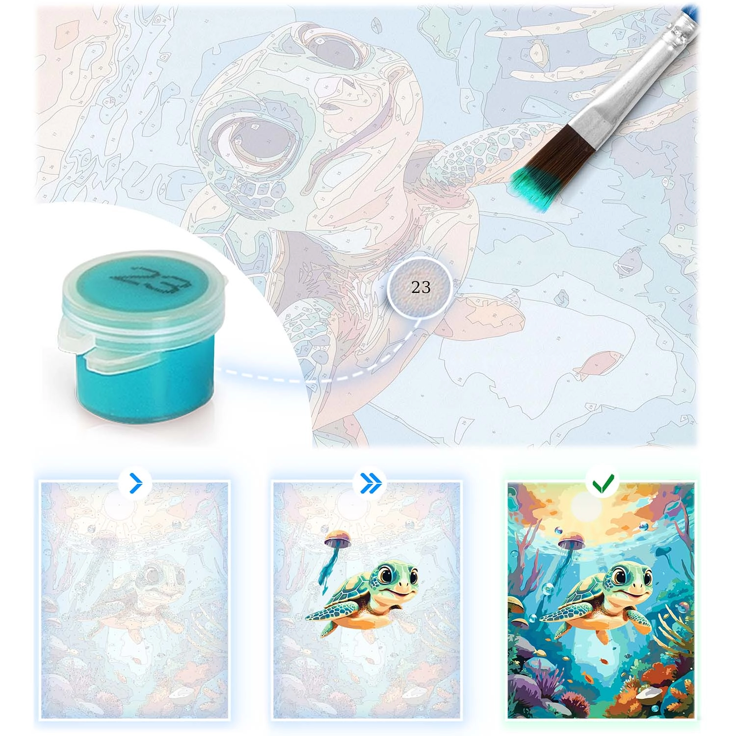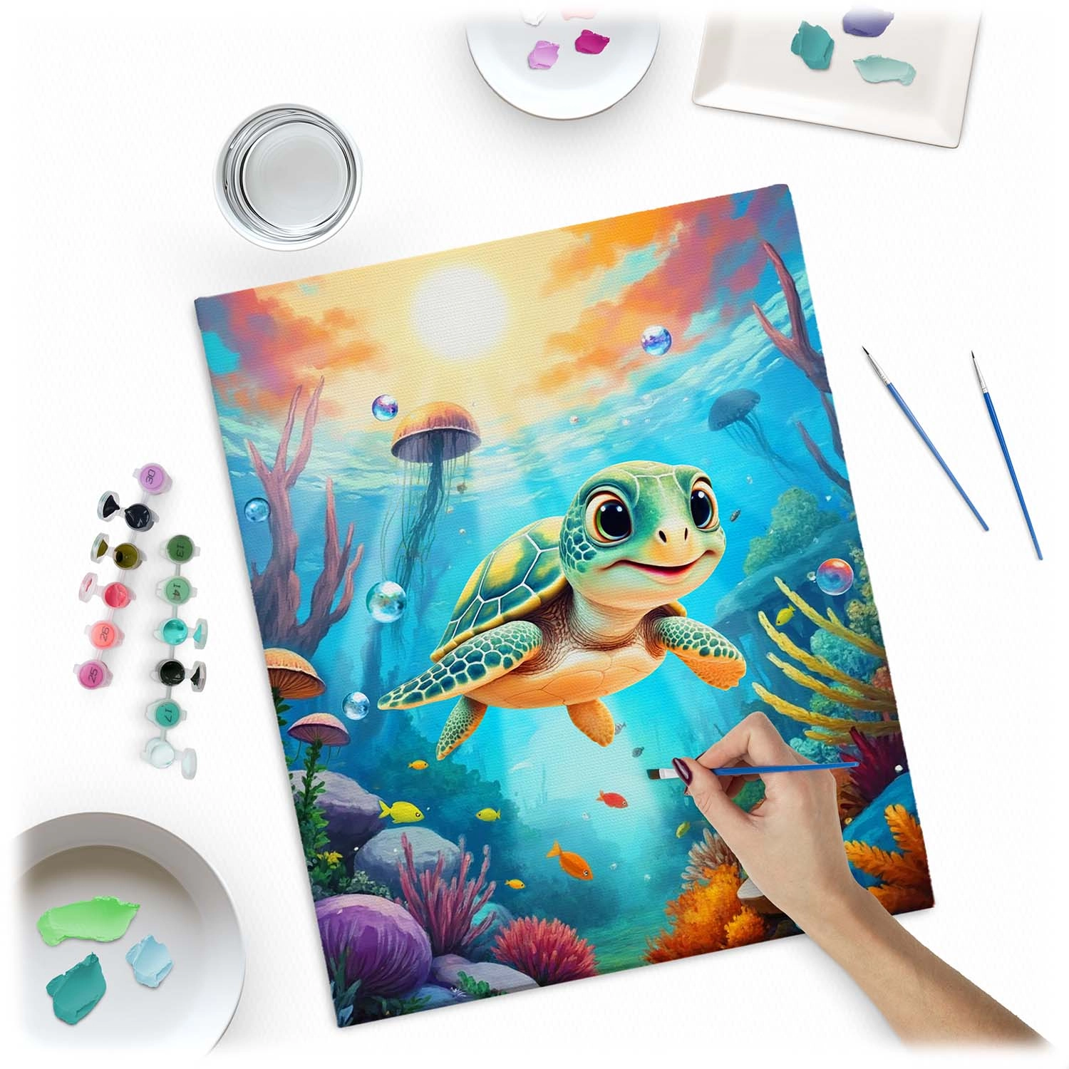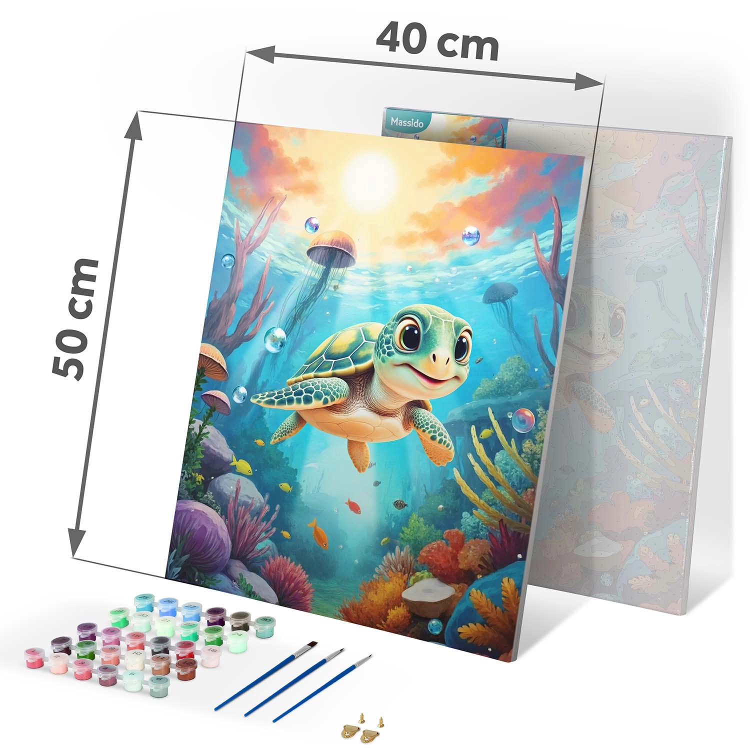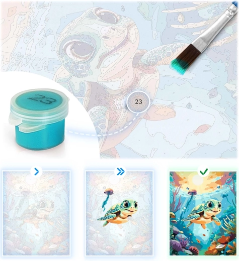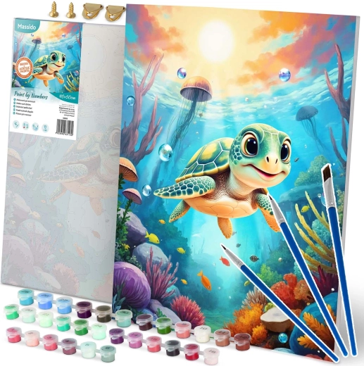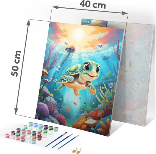 Ez a teljes számozott kifestő szett mindent tartalmaz, amire szüksége van egy gyönyörű kép megalkotásához tengeri kis teknős motívummal. Alapja az alapozott vászon, erős fa vakrámára feszítve, jól olvasható számokkal, színes aláfestéssel a könnyebb tájékozódásért, valamint intenzív, jól fedő akrilfestékekkel, amelyeket nem szükséges hígítani.