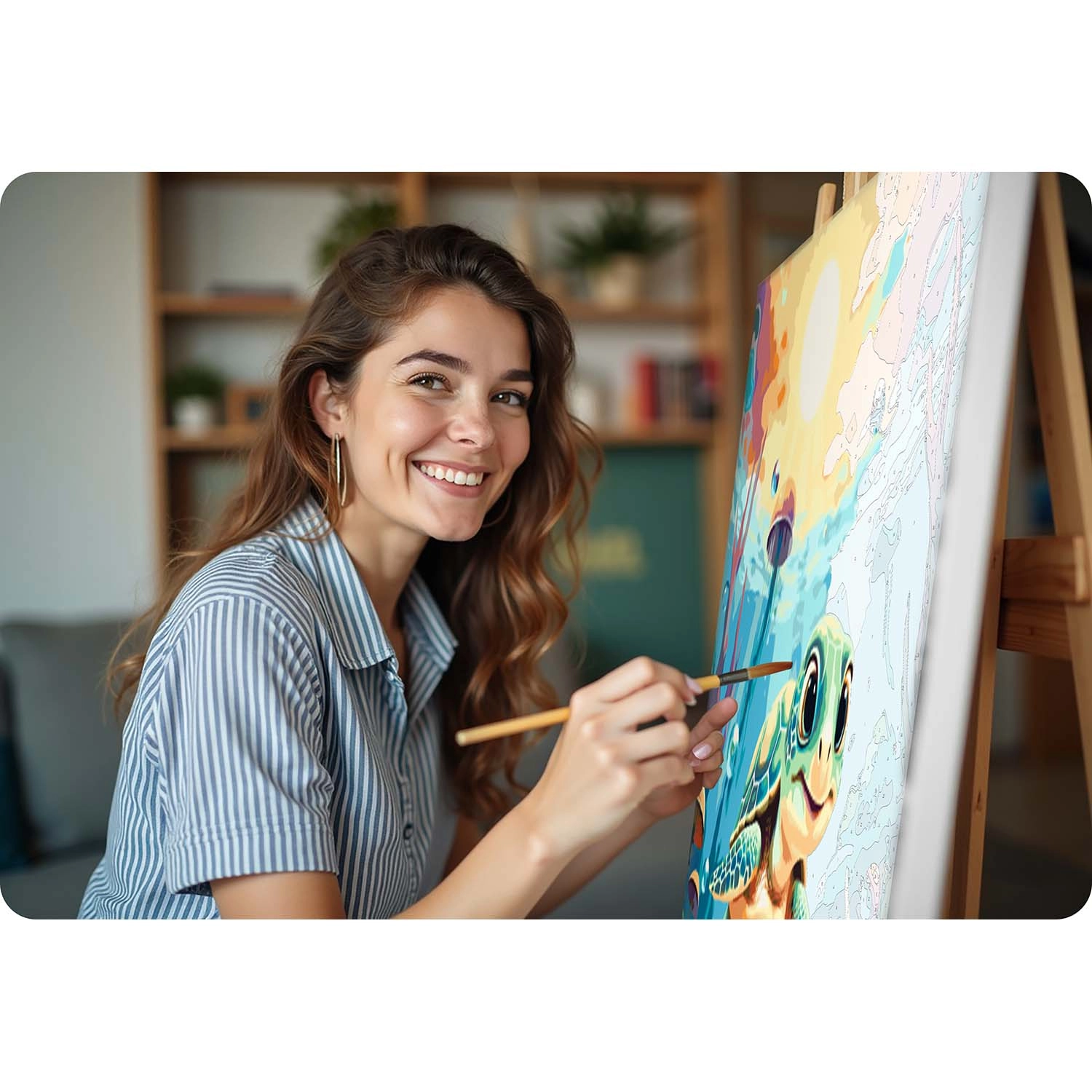 Az áttekinthető jelölésnek köszönhetően valóban bárki festhet. Elég hozzárendelni a számot a festékhez, sorban kitölteni a felületeket, és figyelni, ahogy megszületik a kész alkotás. A csomagban 3 különböző vastagságú ecsetet talál a nagyobb felületekhez, élekhez és finom részletekhez, továbbá akasztókat a kész kép egyszerű felhelyezéséhez.