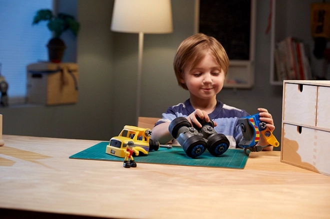 A sárga autómentő működő elemekkel ideális az első csavarozásokhoz. A gyerekek gyakorolják a koordinációt, és már indulhatnak is a lerobbant autók megmentésére.