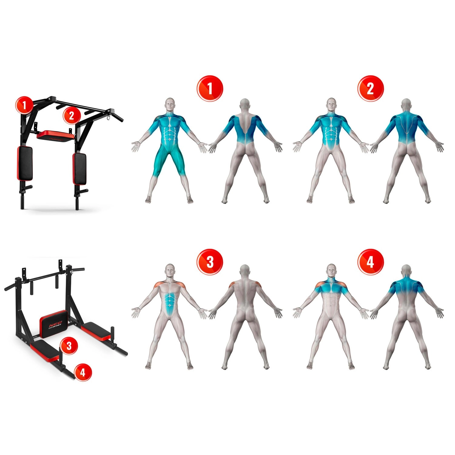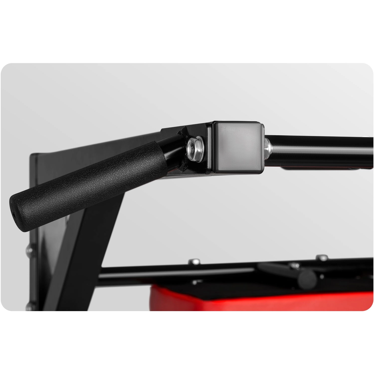 Párnázott hát- és kartámasz védi a testedet tolódzkodás és lábemelés közben. A különböző fogásszélességek és szögek bővítik a gyakorlatok skáláját.