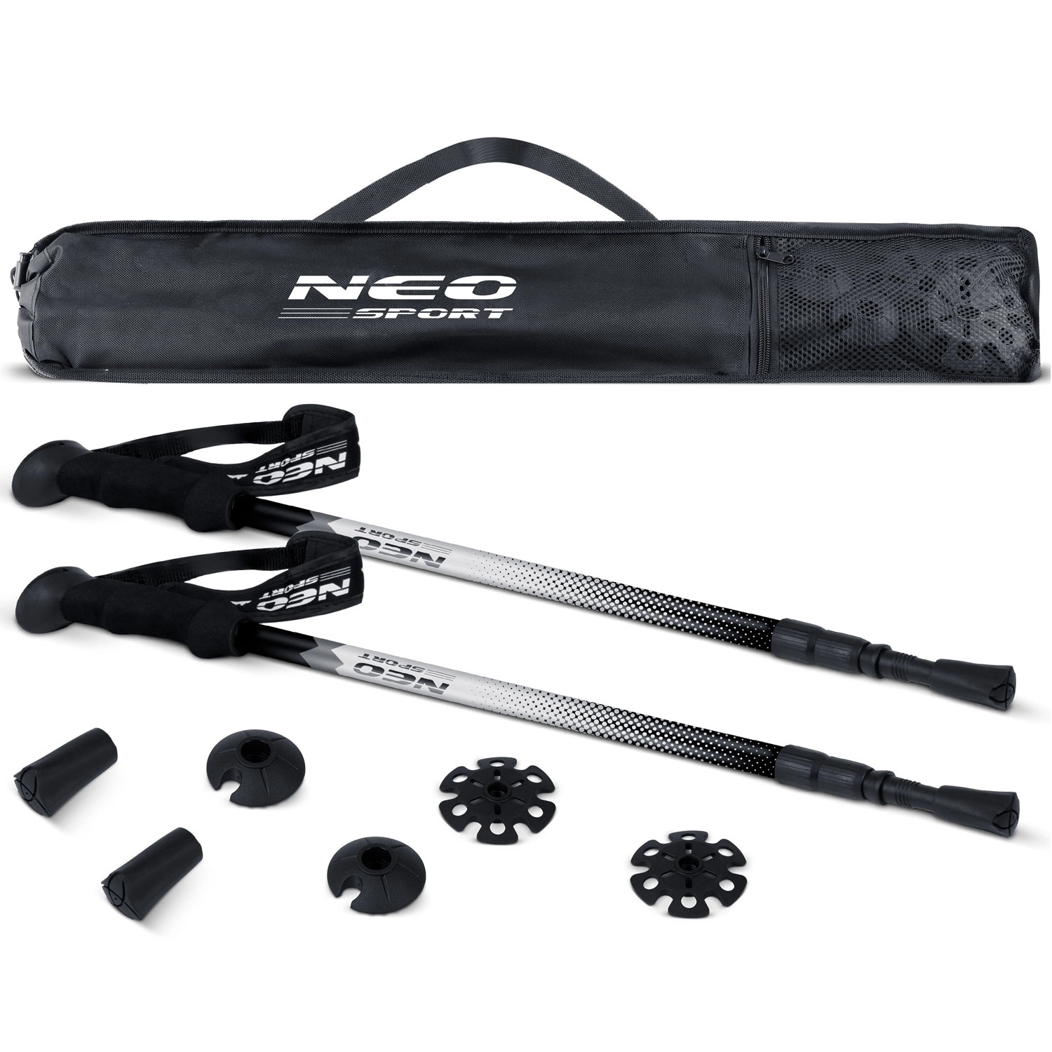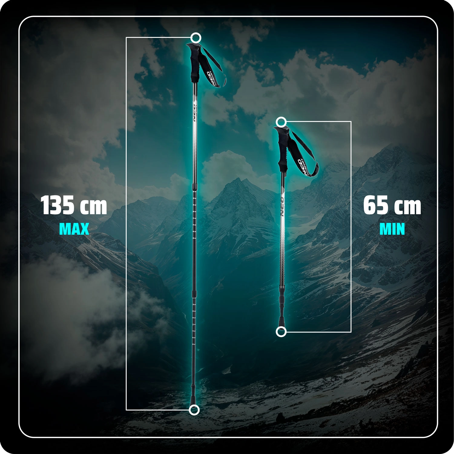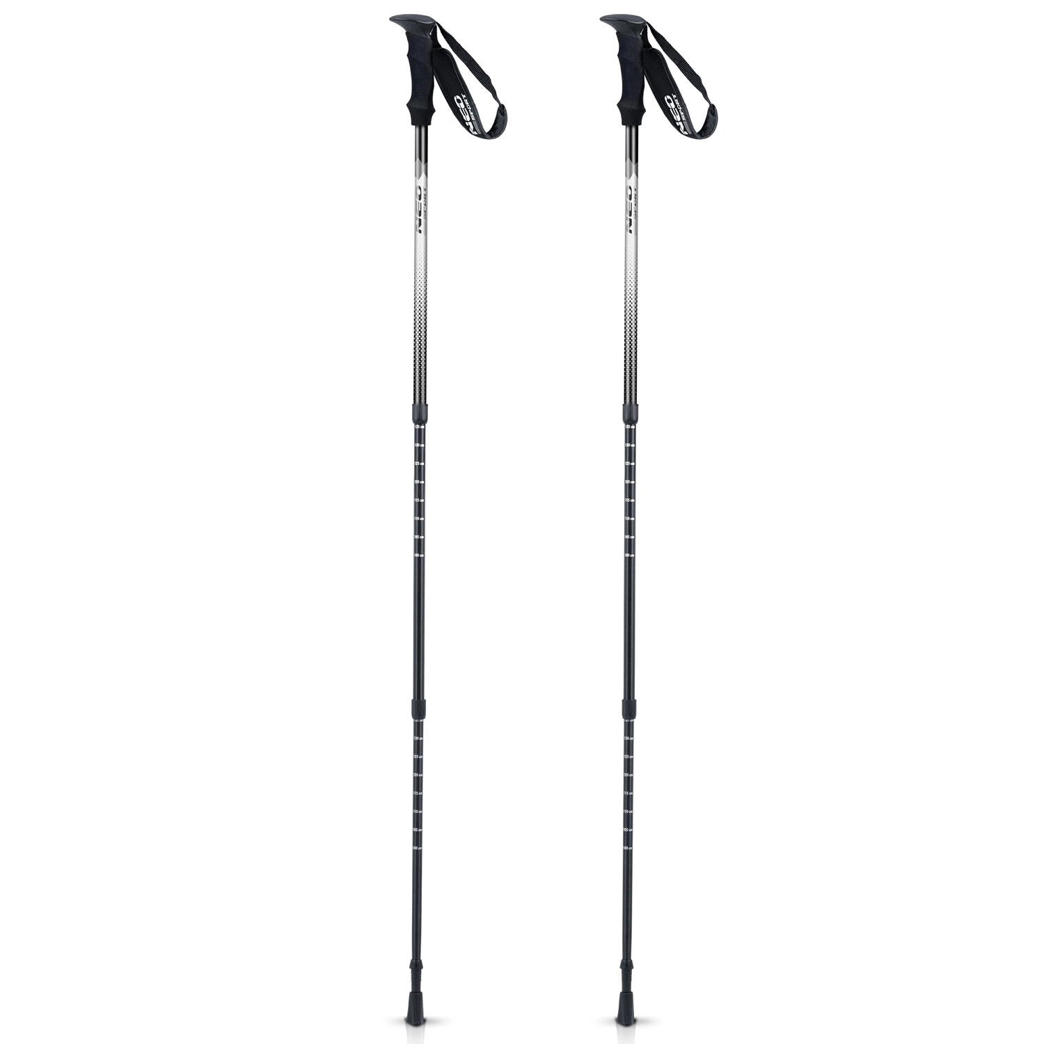 A háromszekciós beállítás skálával lehetővé teszi a hossz pontos finomhangolását testalkat és lejtés szerint. Az összecsukott botok (65 cm) könnyen a hátizsákra rögzíthetők vagy a tokba tehetők.