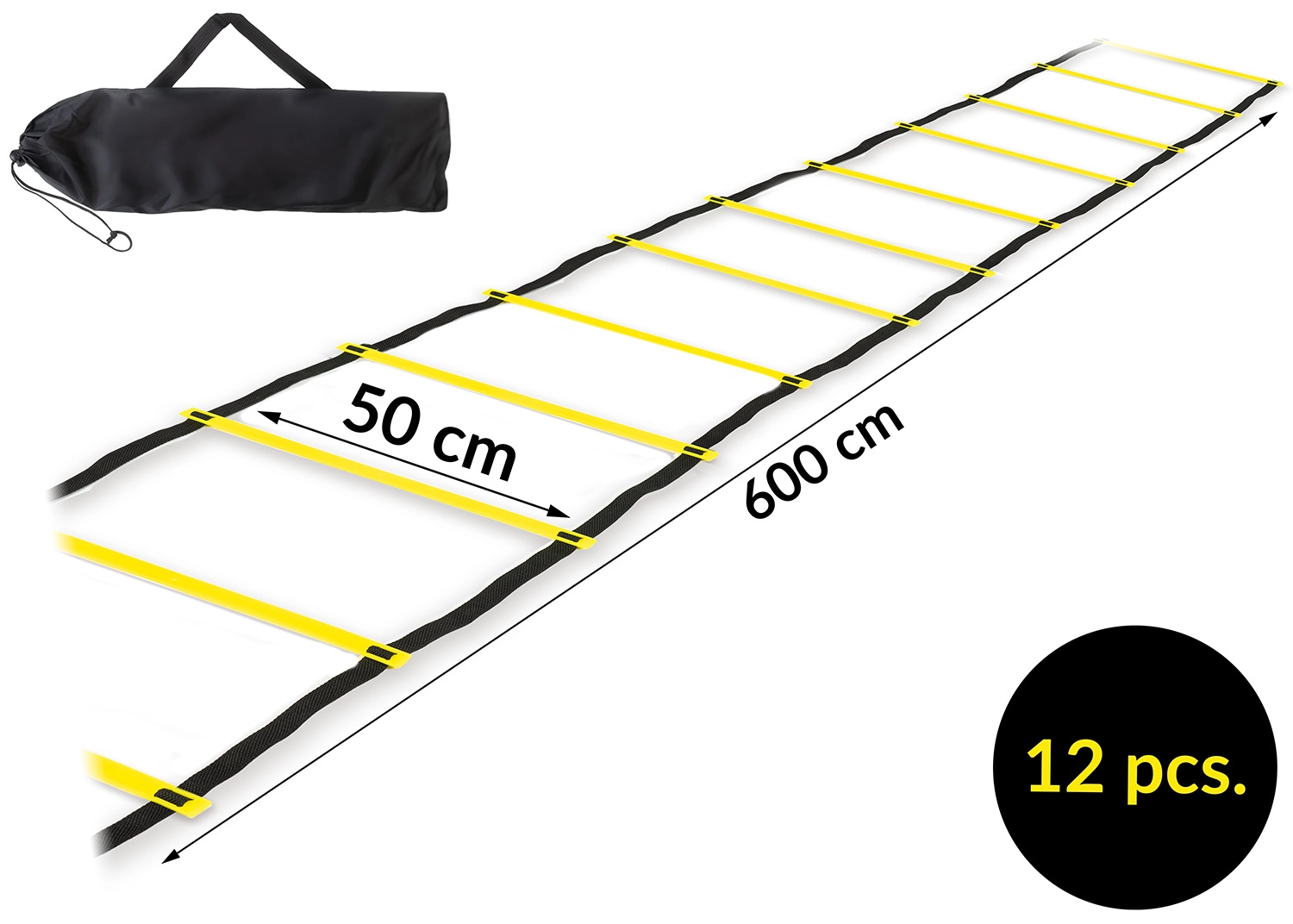 Magas ellenállóképességű koordinációs létra 12 állítható (csúsztatható) fokkal és legfeljebb 6 m hosszúsággal, ideális a sebesség-, agilitás- és koordinációs edzéshez. A tartós PVC és PE szalagokból készült, könnyű kivitel megkönnyíti a hordozást, az állítható foktávolság pedig a gyakorlás nehézségéhez igazítható. A csomag része egy praktikus, ingyenes hordtáska füllel.