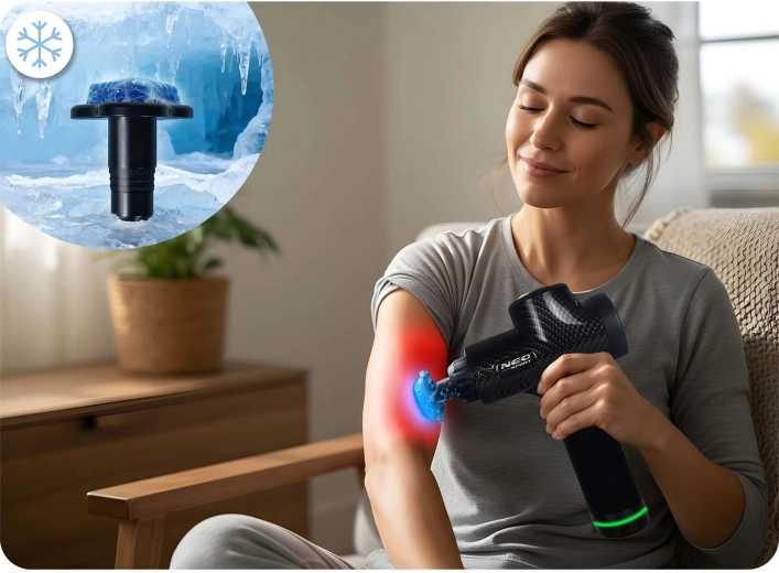 - Hűsítő gélfej: előzetes lehűtés után megnyugtatja az irritációt, csökkenti a duzzanatot és a gyulladást – ideális túlterhelés vagy intenzív igénybevétel után.