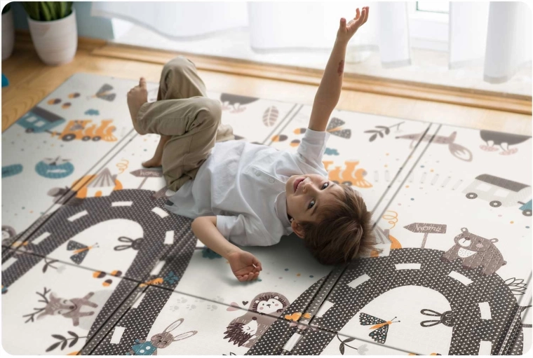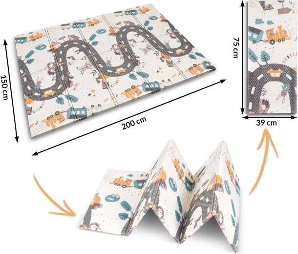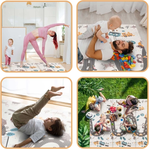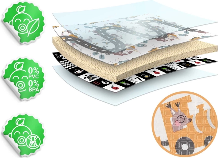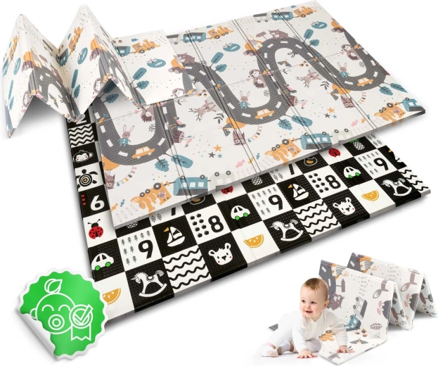 Praktikus és stílusos, kiváló minőségű XPE habból készült gyerek játszószőnyeg 200 × 150 × 1 cm méretben, amely puha és biztonságos környezetet nyújt játékhoz, kúszáshoz és az első lépésekhez. Kétoldalas (oktató, kontrasztos oldal és állatokkal díszített játékos útminta), összecsukható, könnyű, vízálló és könnyen tisztítható. A csúszásgátló textúrának, a padlótól való hőszigetelő védelemnek és a BPA-, PVC-, ftalát- és formamidmentes összetételnek köszönhetően megfelel a szigorú európai szabványoknak, és prémium kényelmet és biztonságot nyújt a gyerekeknek.