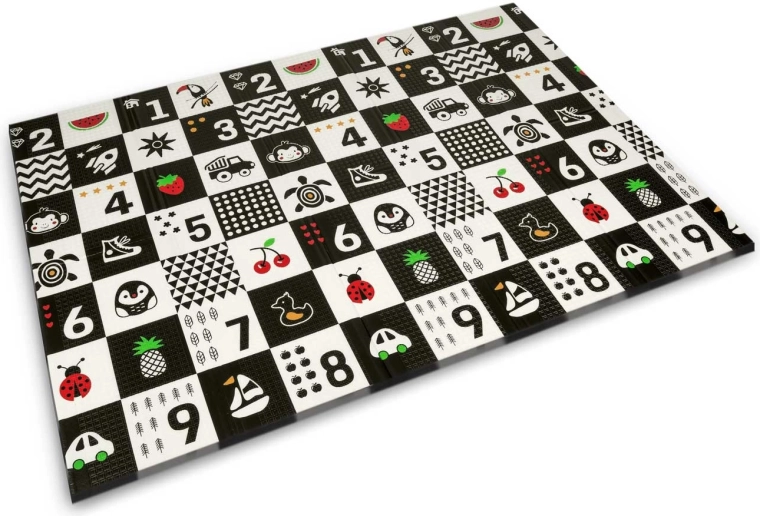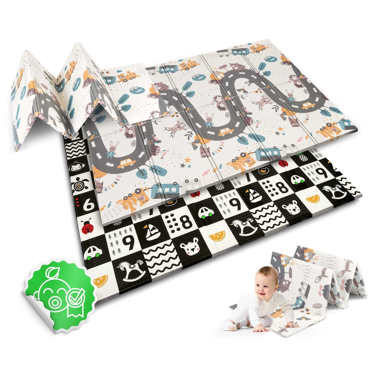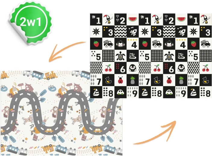 Magas kontrasztú oldal számokkal és ikonokkal a korai tanuláshoz és vizuális stimulációhoz, a másik oldal úttal és állatokkal az autós és kreatív játékokhoz.