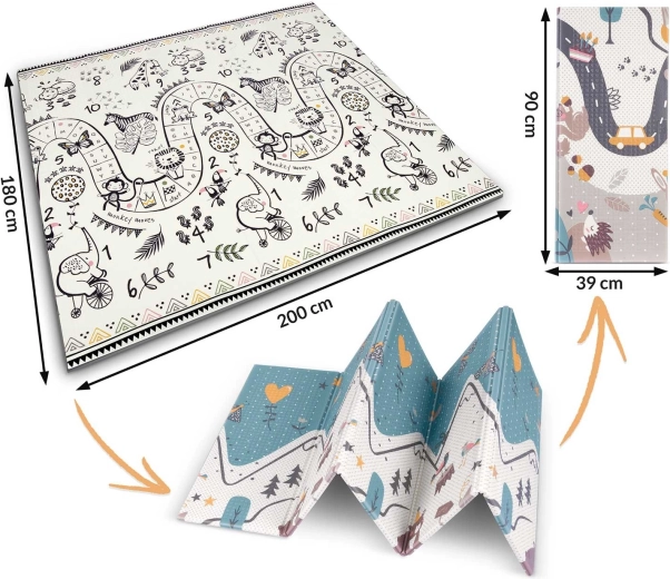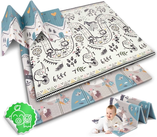 Fedezze fel a praktikus és elegáns játszófelületet babáknak és óvodásoknak. A kétoldalas, edukatív minták felfedezésre ösztönzik a számokat, állatokat és alakzatokat, miközben a puha XPE hab magabiztosságot ad az első kúszási és járási próbálkozásoknál. A szőnyeg harmonikaszerűen hajtható, így gyorsan áthelyezhető, autóba tehető vagy az ágy alá csúsztatható.