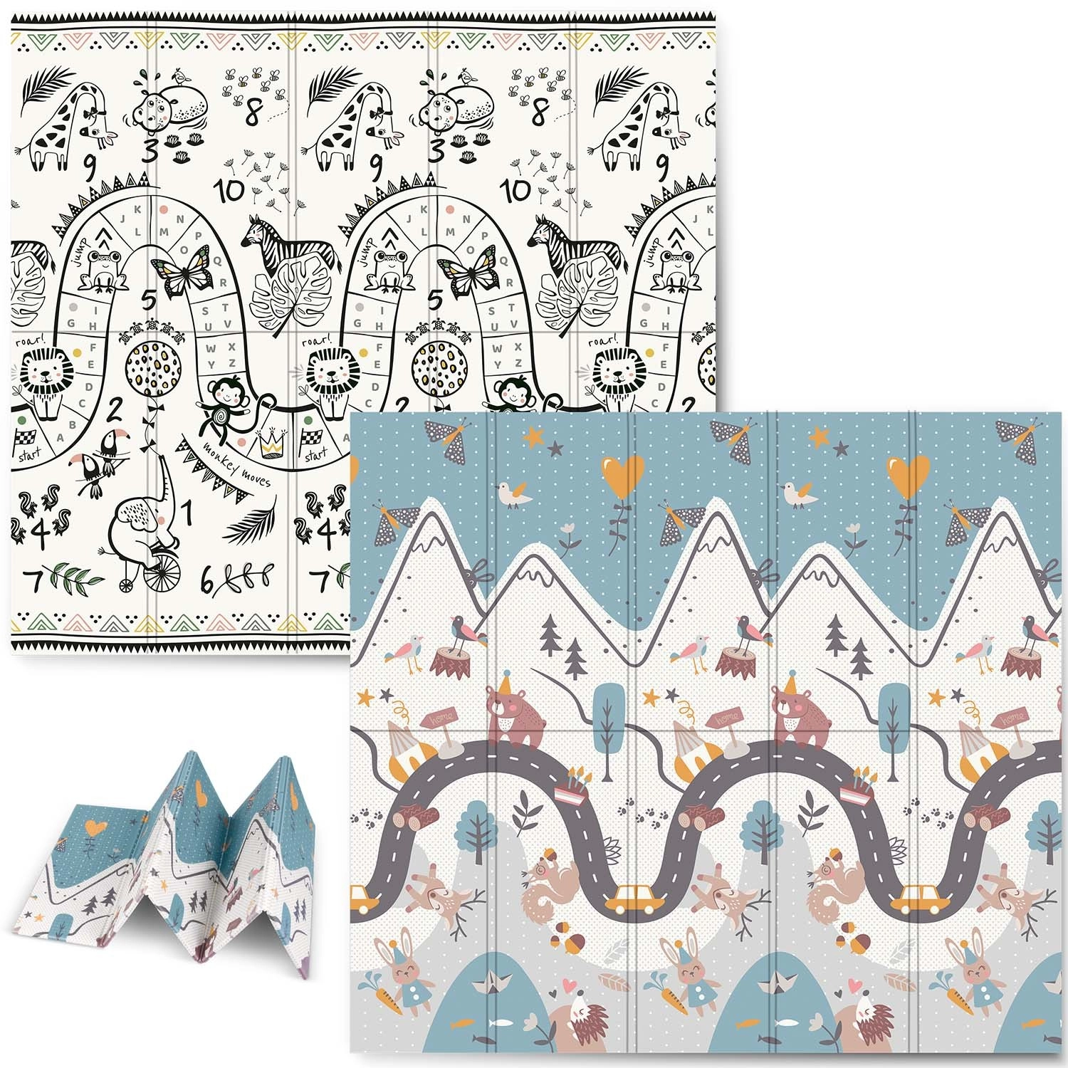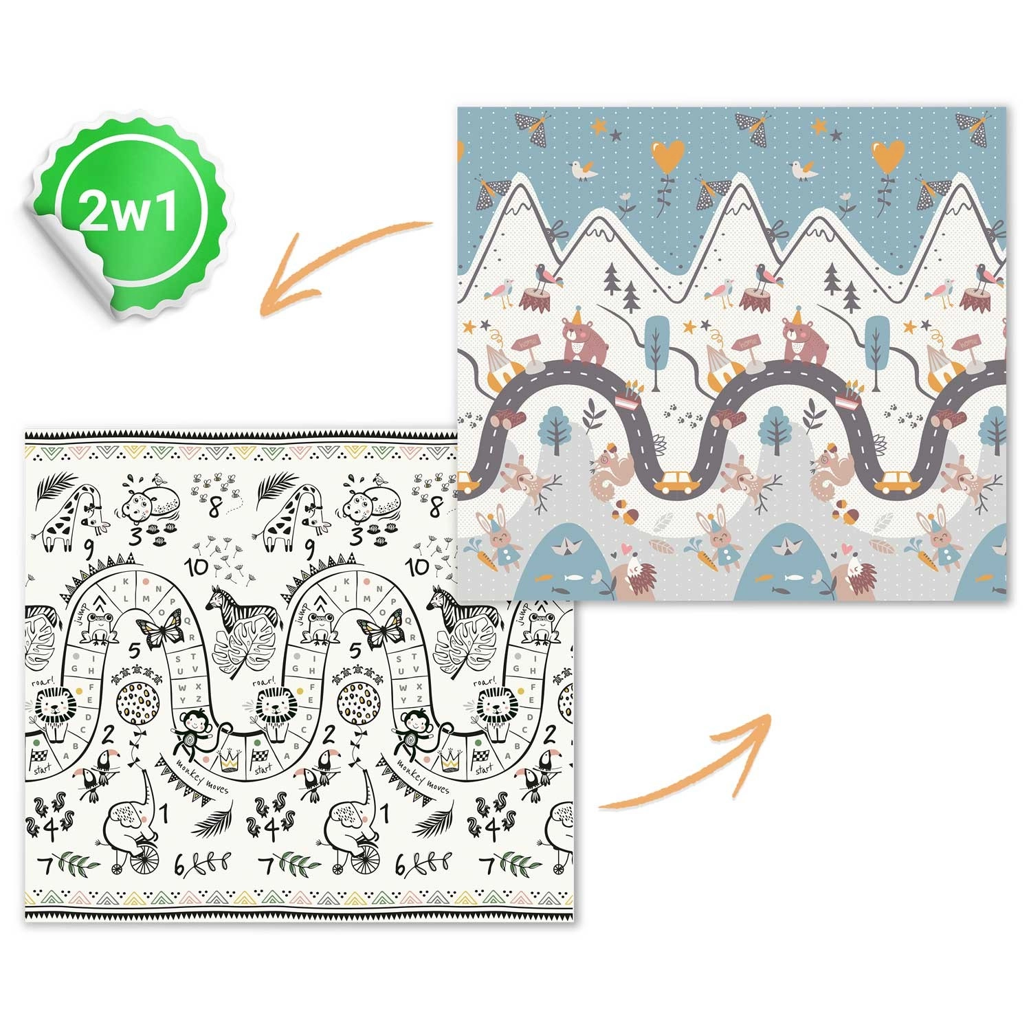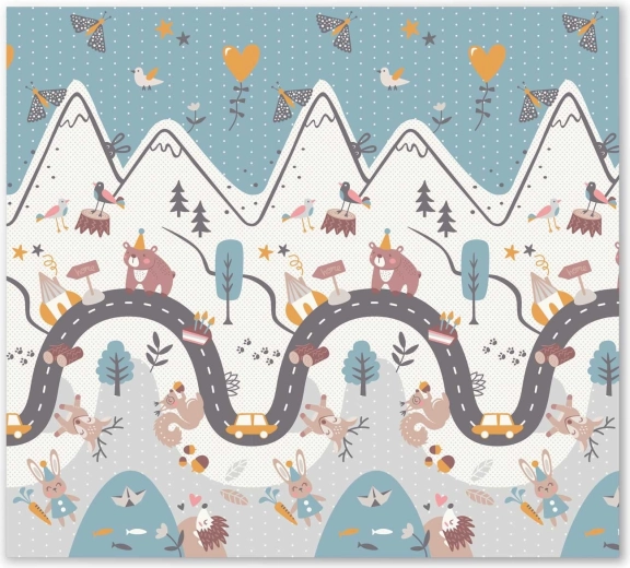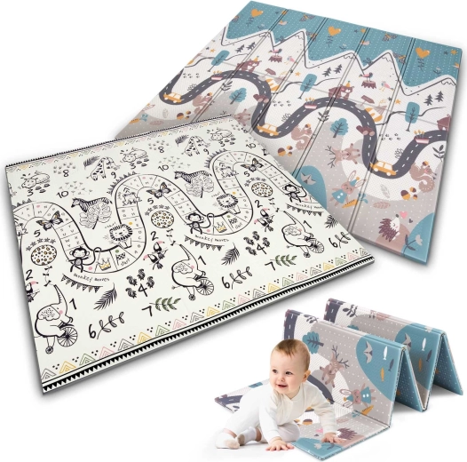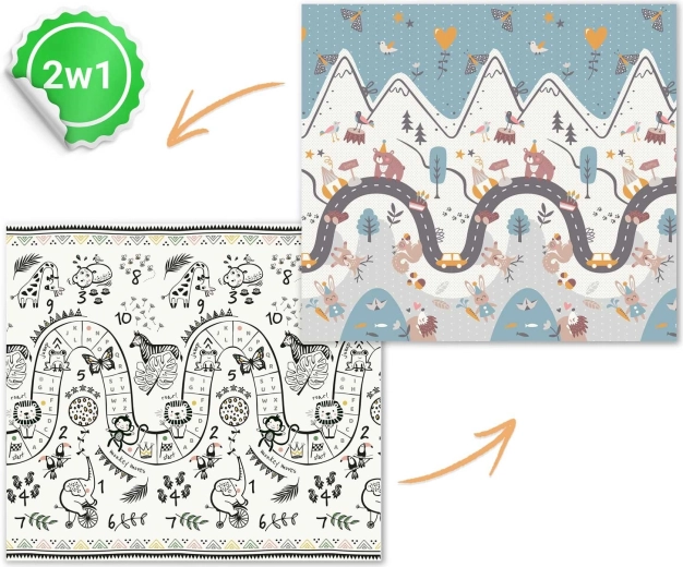 Az egyik oldal színes hegyi úttal, a másik kontrasztos számokkal és állatkákkal a játékos tanulásért. Elég megfordítani a szőnyeget, és máris megváltozik a játszósarok hangulata.