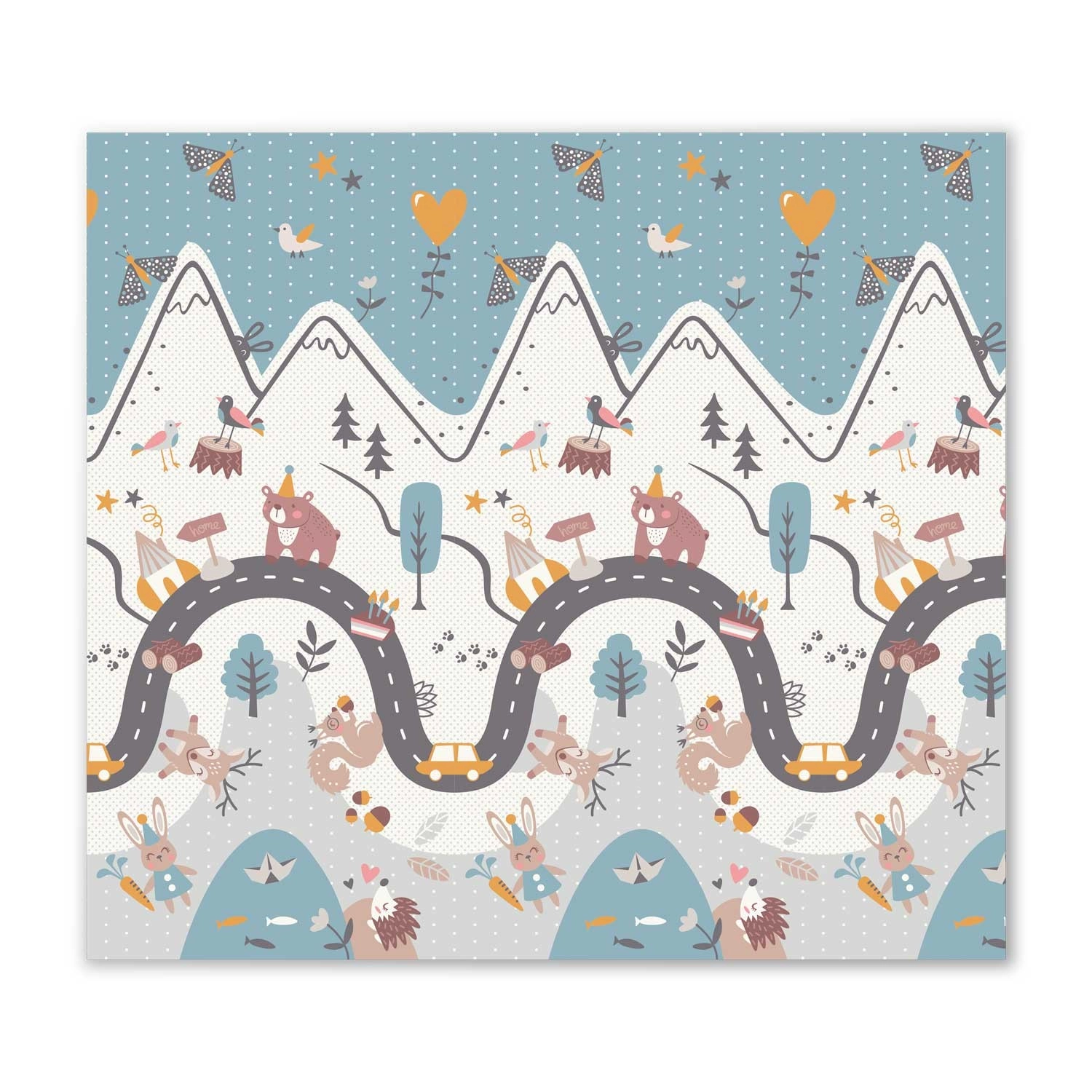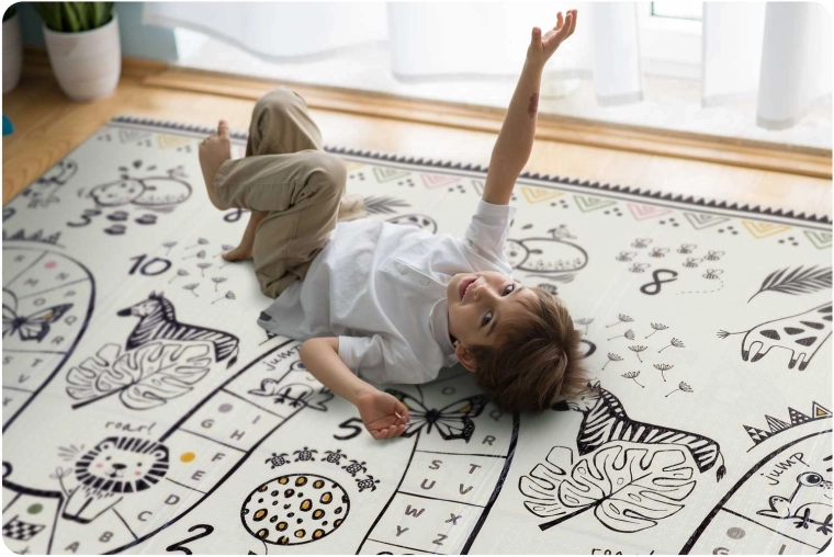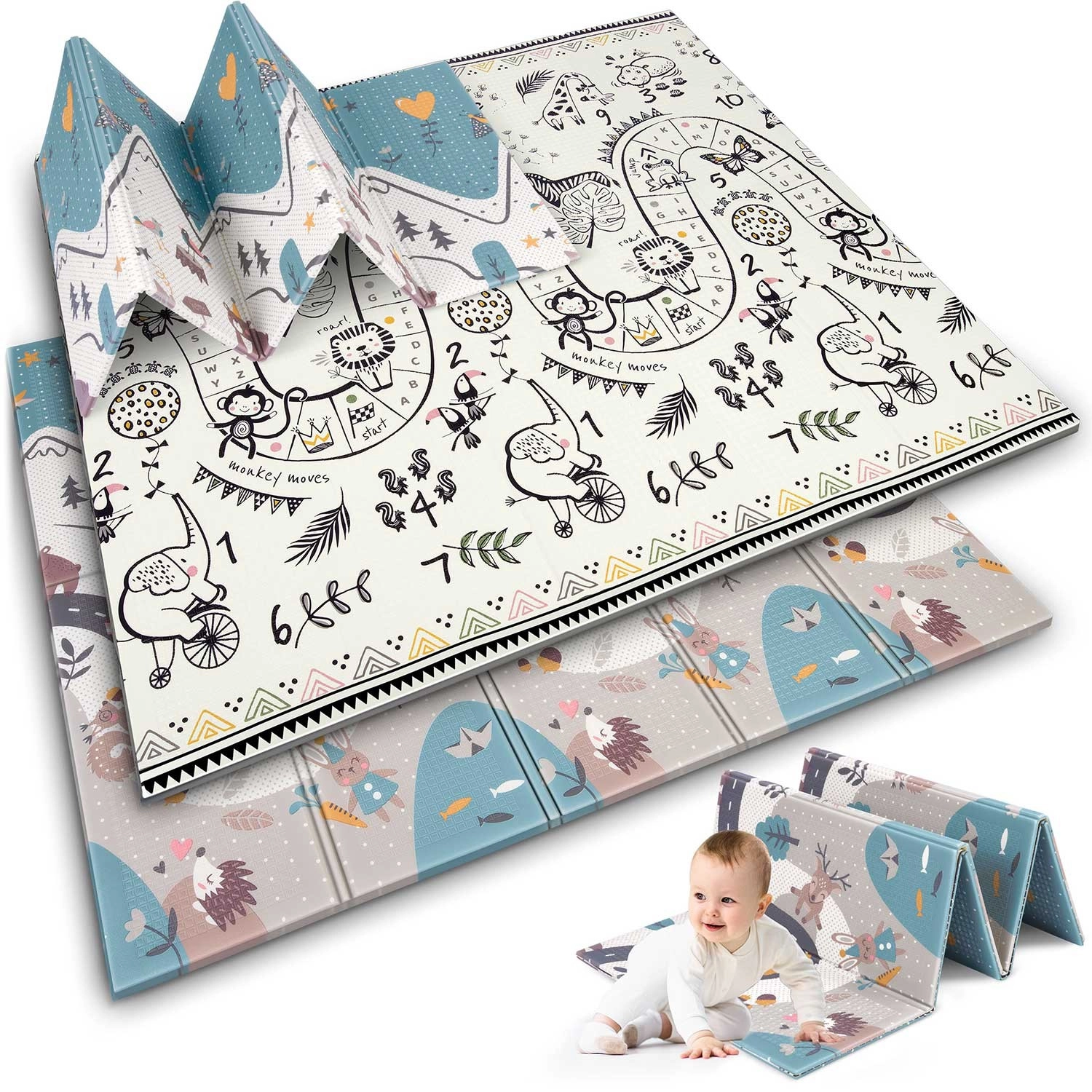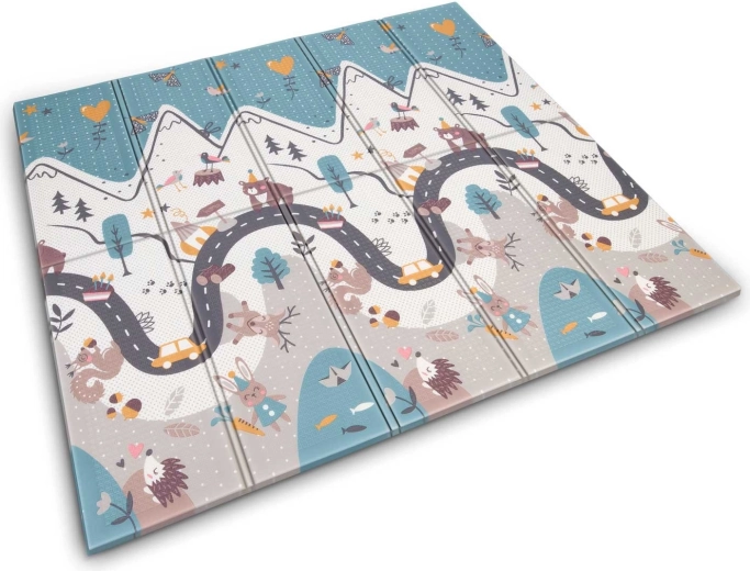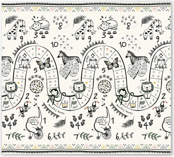 Az egyik oldal színes hegyi úttal, a másik kontrasztos számokkal és állatkákkal a játékos tanulásért. Elég megfordítani a szőnyeget, és máris megváltozik a játszósarok hangulata.