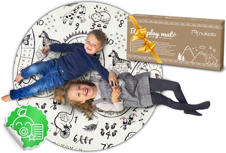 A NUKIDO nagy, kétoldalas, összecsukható szőnyege minőségi XPE habból gyermekeknek puha és biztonságos helyet biztosít játékhoz és tanuláshoz. Könnyű, vízálló, könnyen tisztítható, 1 cm vastagságának köszönhetően kiválóan csillapítja az ütéseket és hőszigetel a hideg padlótól. A csúszásgátló felület támogatja a durva- és finommotorikát, az anyag BPA-, PVC-, ftalát- és formamidmentes, és megfelel a CE és EN71 szabványoknak.