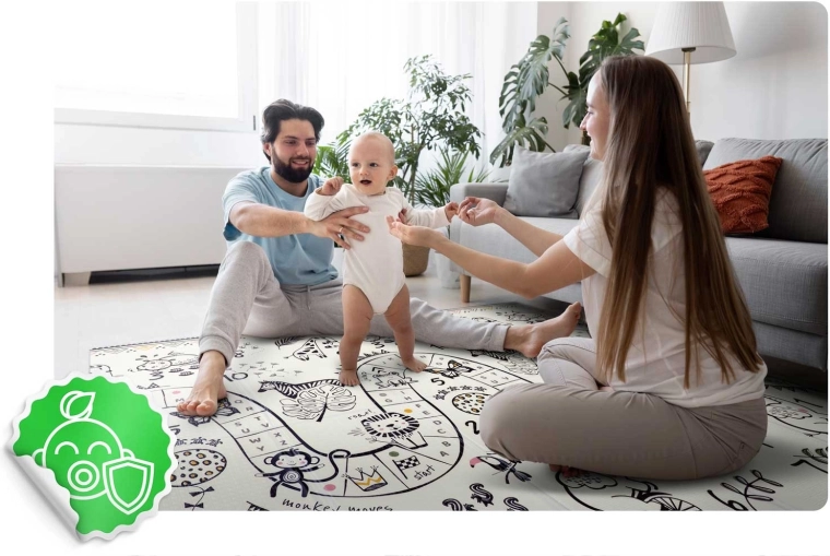A vízálló felületnek köszönhetően pillanatok alatt letisztítható egy nedves kendővel. Az 1 cm vastagság megbízható rugalmasságot ad a kemény felületeken, mint a csempe vagy parketta, és kellemes meleget biztosít játék közben. A szőnyeg nem csúszik, nem szakad, és az allergiás gyerekek számára is kíméletes – nem szívja magába a port és az atkákat.