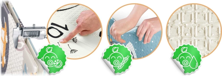 Az 1 cm vastagság tompítja az eséseket és véd a kemény padlón. Az anyag nem mérgező, szagtalan, és megfelel a szigorú európai szabványoknak.