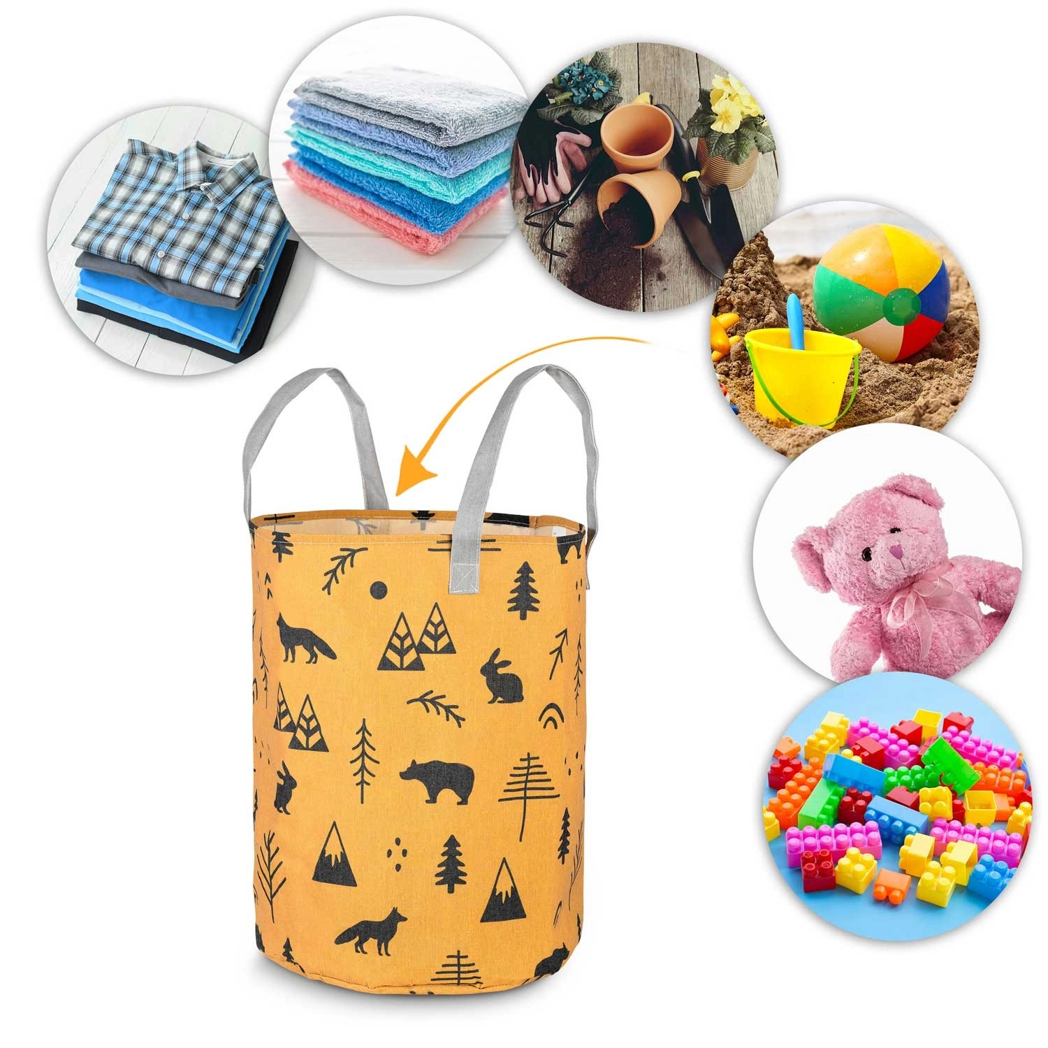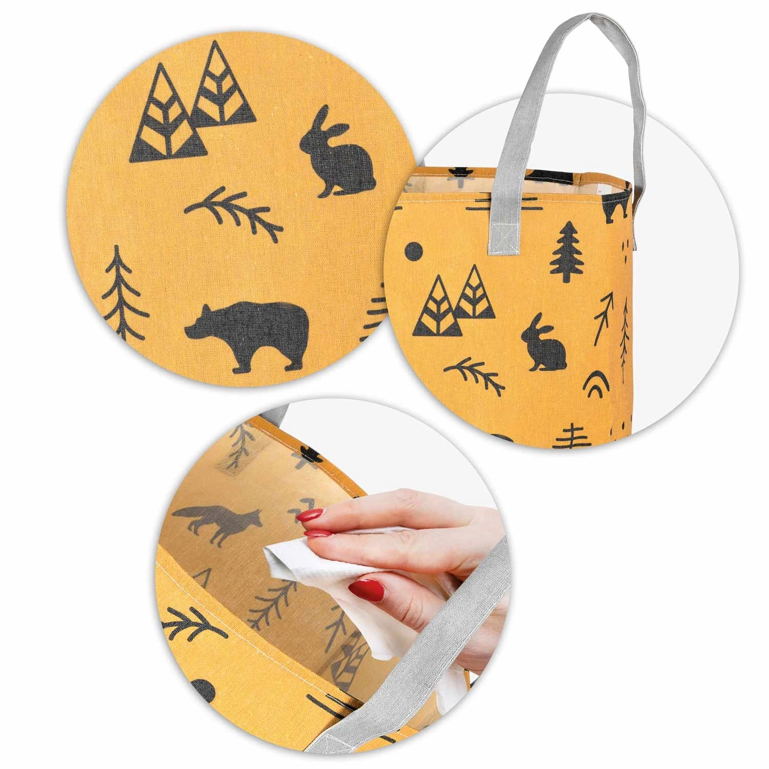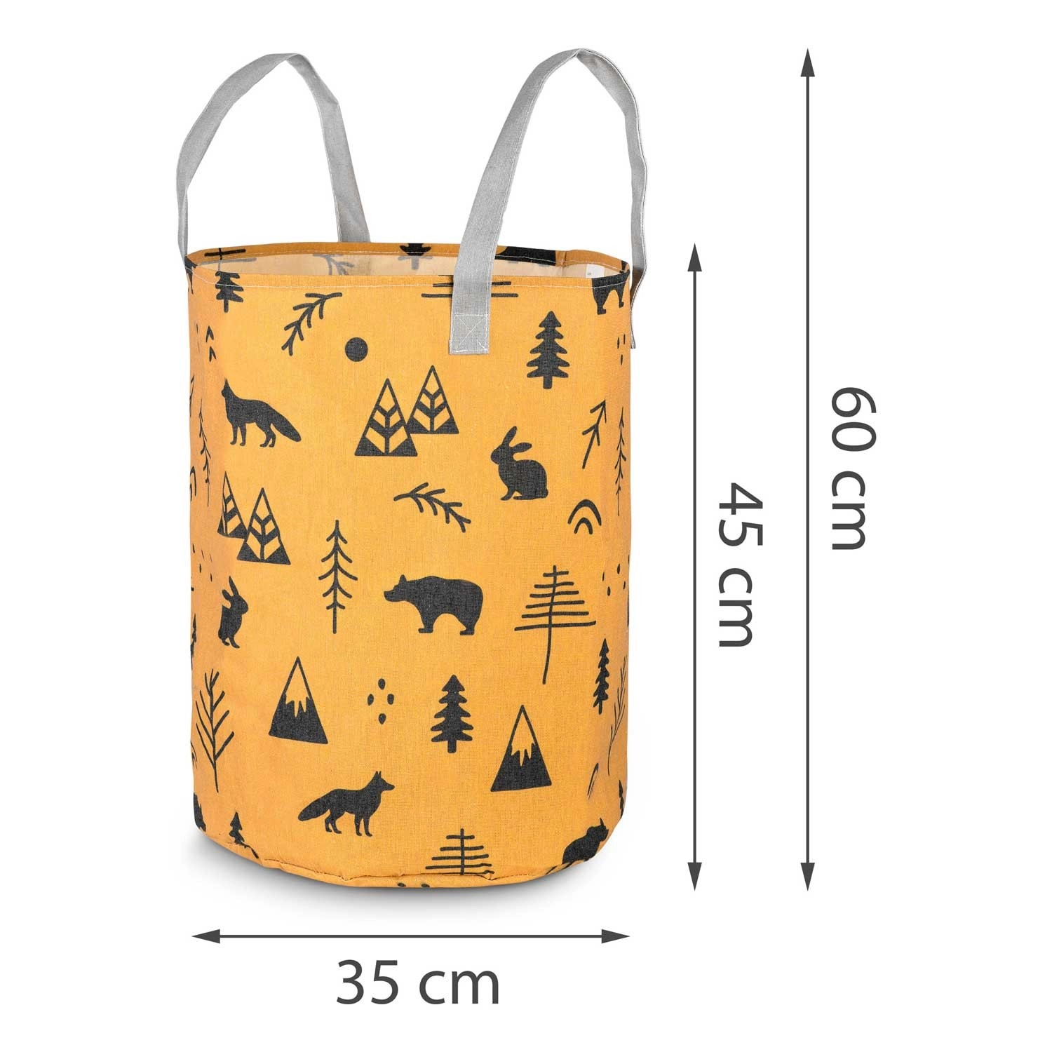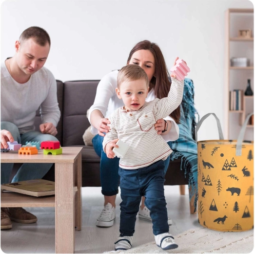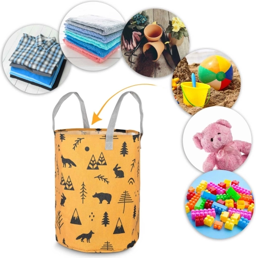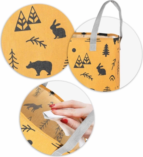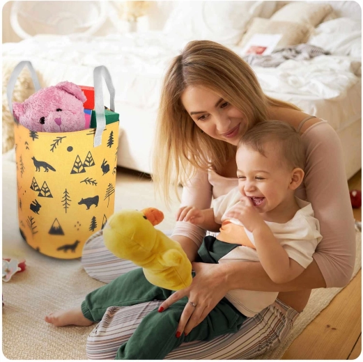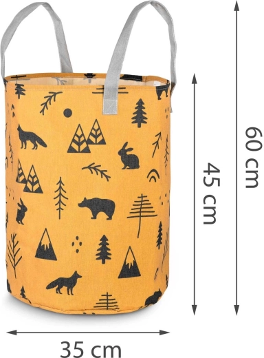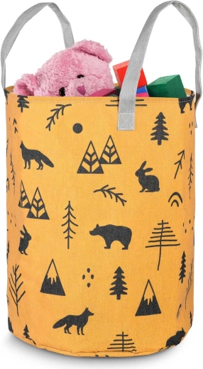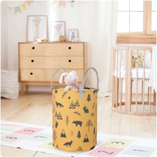 Változtassa a takarítást szórakozássá! A sárga, erdei motívumokkal díszített NUKIDO textil játék tárolókosár úgy készült, hogy funkcionális, tartós és esztétikus legyen. A magas, hengeres forma és a nyitott teteje révén könnyedén elhelyezhetők benne a plüssök, kockák és apróságok – és pillanatok alatt újra elővehetők.
