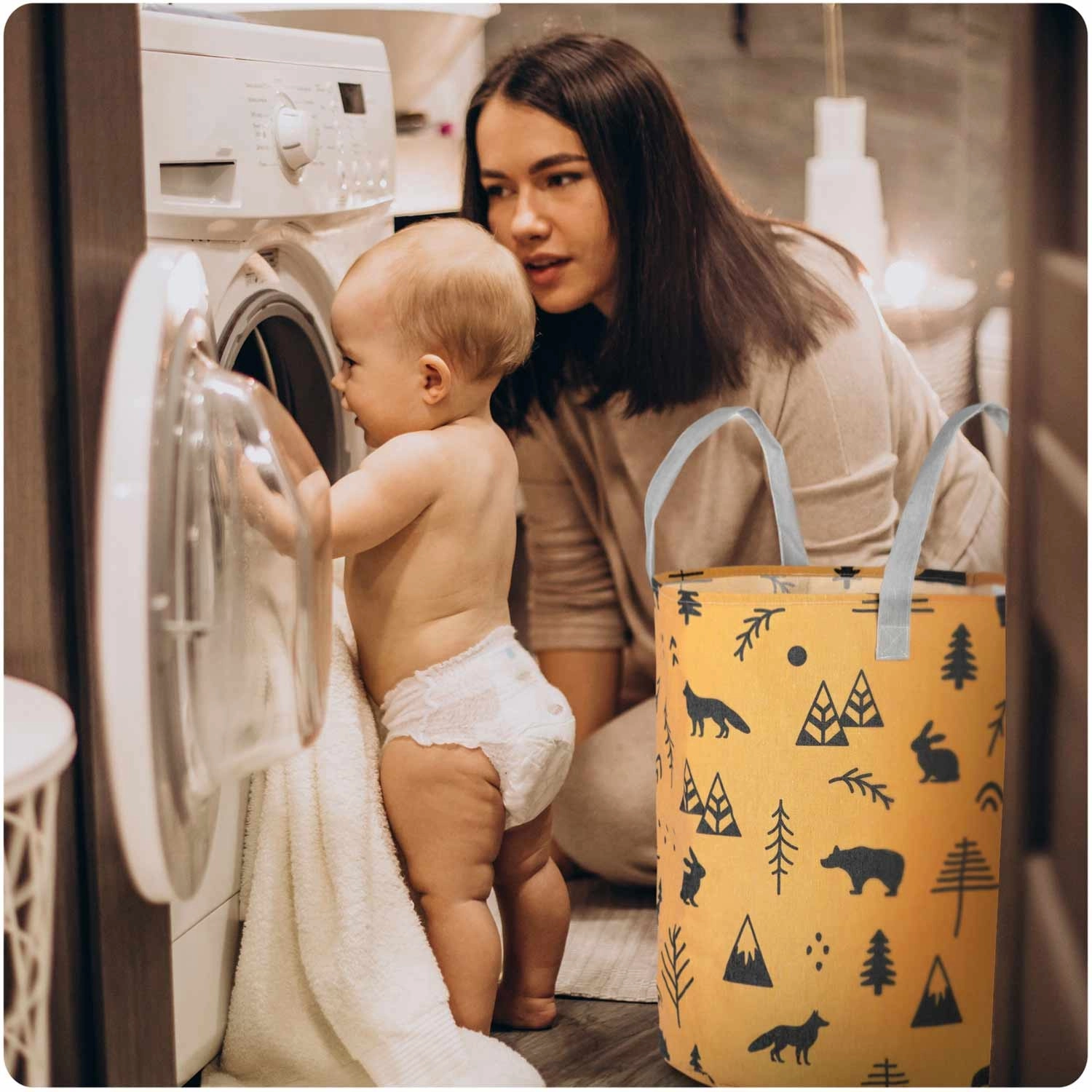 A kosár könnyű és hordozható a masszív füleknek köszönhetően, mégis tartja a formáját és önállóan megáll. Illik a gyerekszobába, a fürdőbe és a nappaliba is – használható játékok, szennyes, takarók vagy kiegészítők tárolására. A felület könnyen tisztítható, a minta pedig otthonos, játékos hangulatot ad a térnek.
