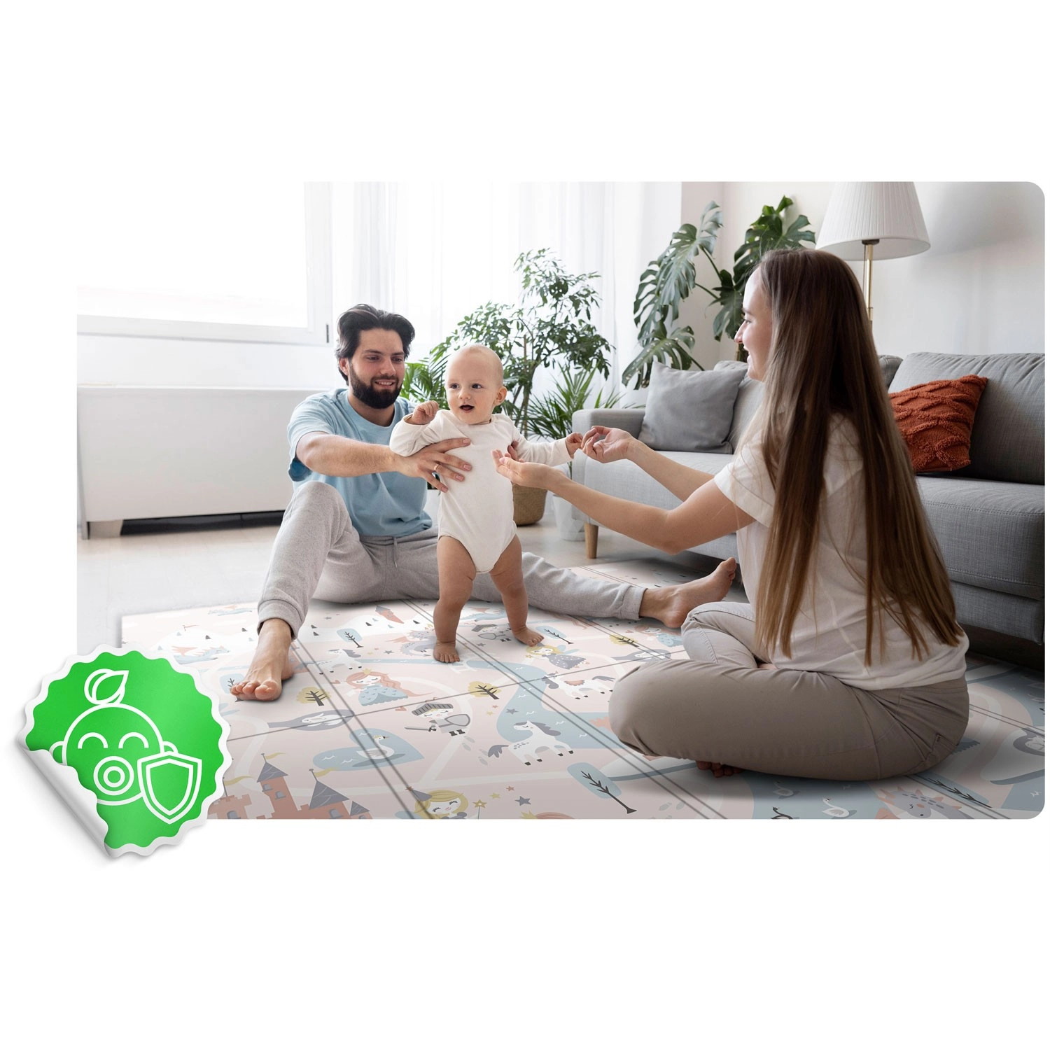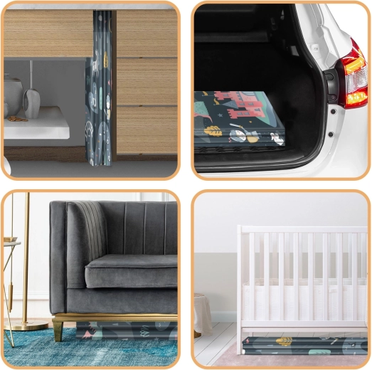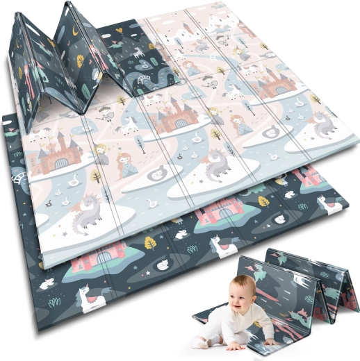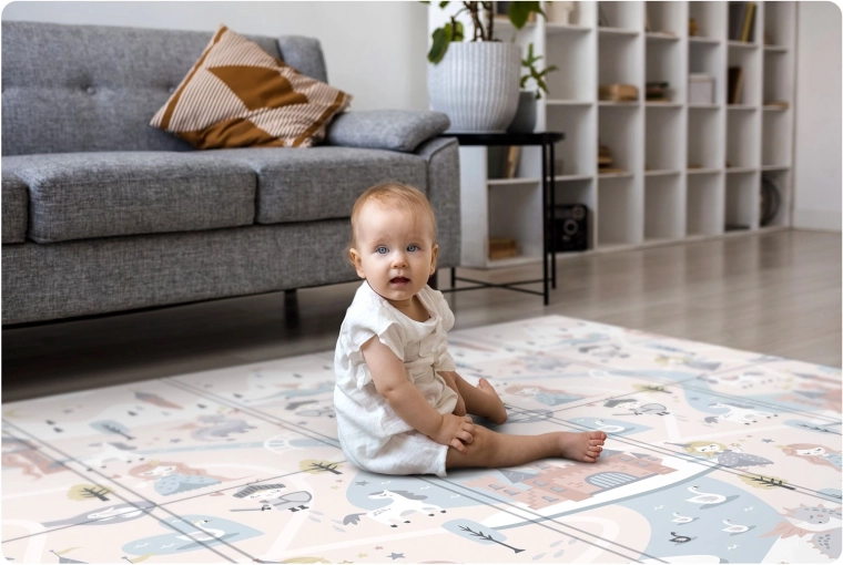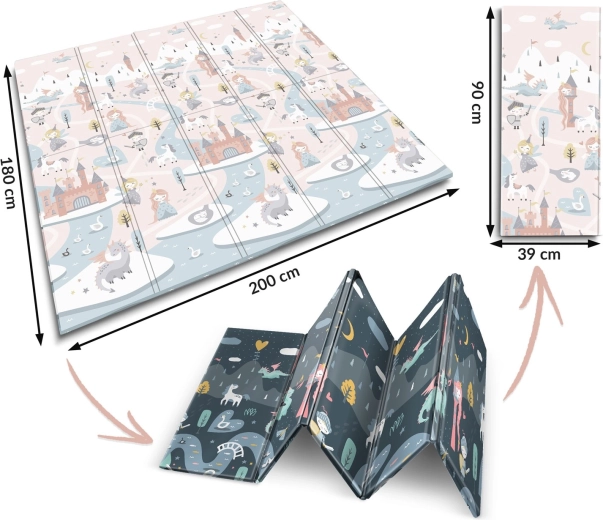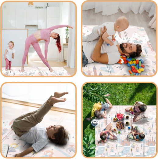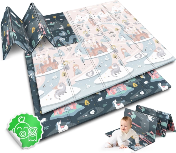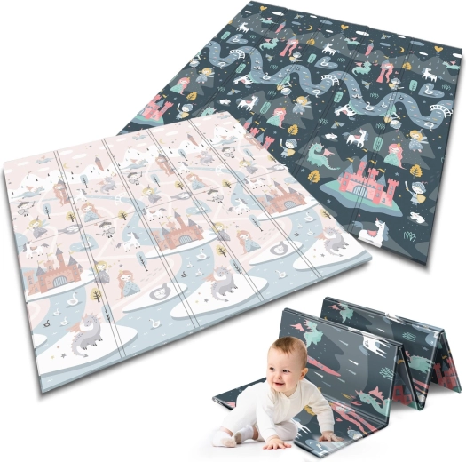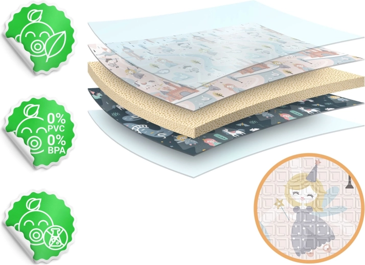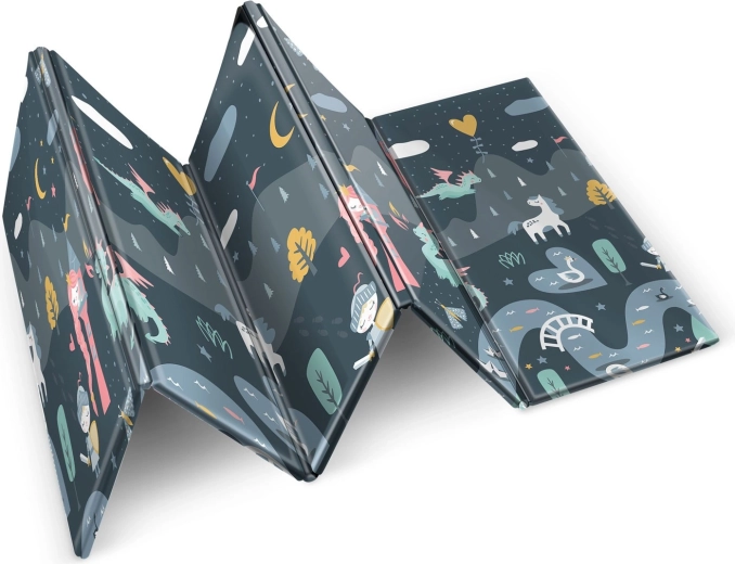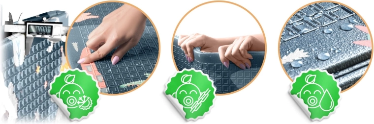 A szőnyeg gyorsan, harmonikaszerűen összehajtható, könnyen hordozható, és ágy alá vagy autóba tehető. A vízálló felületet elég nedves ruhával áttörölni – otthon, látogatóban vagy kinti pikniken is értékelni fogja. Az anyag BPA/PVC/ftalát/formamid mentes, megfelel a CE és EN71-1/2/3 teszteknek, így megbízható minőségre és biztonságra számíthat.