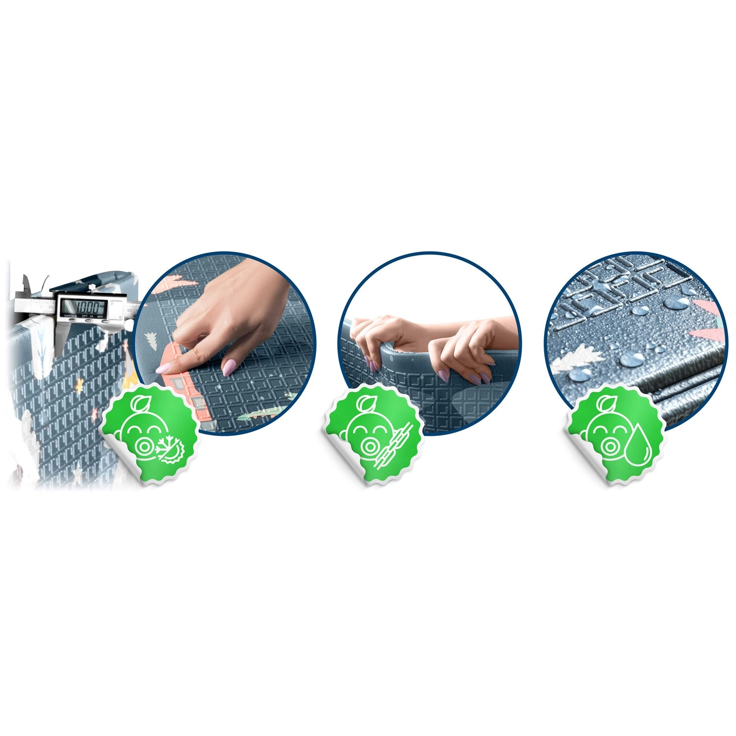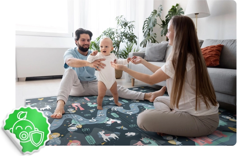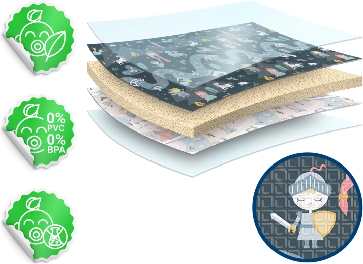 A szőnyeg vízálló és könnyen tisztítható – elég nedves kendővel áttörölni. A csúszásgátló felület stabilitást biztosít különböző padlókön, a masszív, többszöri összehajtás pedig megkönnyíti a hordozást és a tárolást otthon, autóban vagy az ágy alatt. Az anyag nem tartalmaz BPA-t, PVC-t, ftalátokat és formamidot, és megfelel az EN71 európai biztonsági szabványoknak, CE tanúsítással együtt.