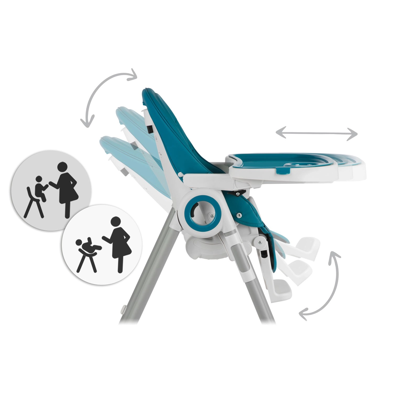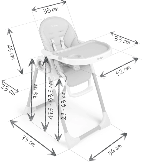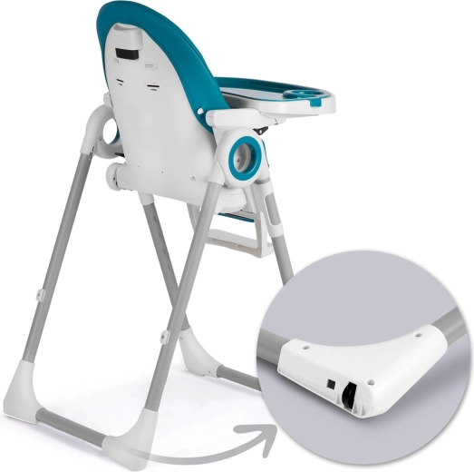 A levehető tálca megemelt peremű kiegészítő betéttel megelőzi a kiömlést, és folyó víz alatt tisztítható vagy betehető a mosogatógépbe. A huzat szennyeződésálló és könnyen tisztítható – elég áttörölni. A kompakt, egy mozdulattal történő összecsukásnak és a hátsó lábakban lévő kerekeknek köszönhetően a széket könnyedén áthelyezheti.