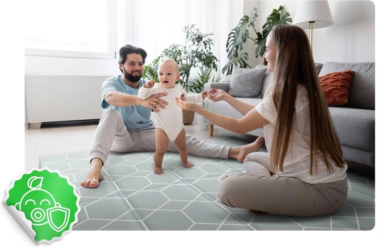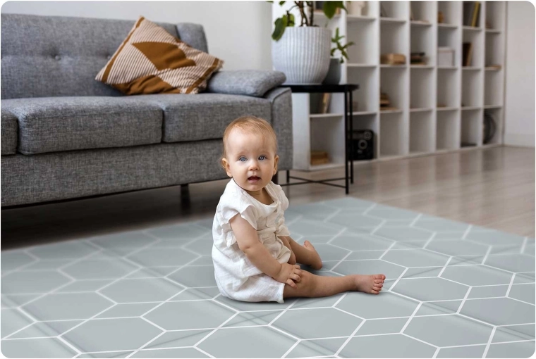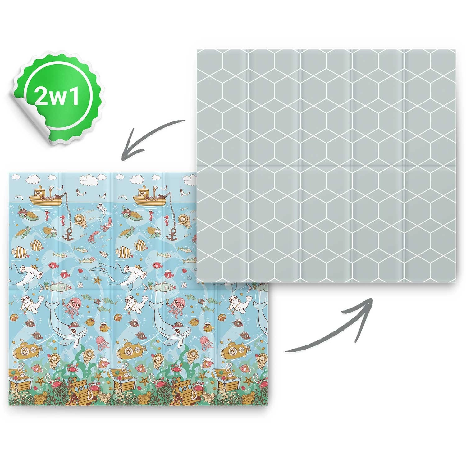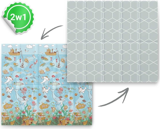 A stílusos és biztonságos NUKIDO szőnyeg együtt nő gyermekével – az első átfordulási és kúszási próbálkozásoktól egészen az alkotáson, tornázáson és játékokon át. A kétoldalas kialakításnak köszönhetően könnyen illeszthető az enteriőrhöz: az egyik oldalon finom geometrikus minta, a másikon vidám óceáni motívum. A 1 cm vastag, strapabíró XPE hab kiválóan csillapítja az ütéseket és hőszigetel a hideg padló ellen.