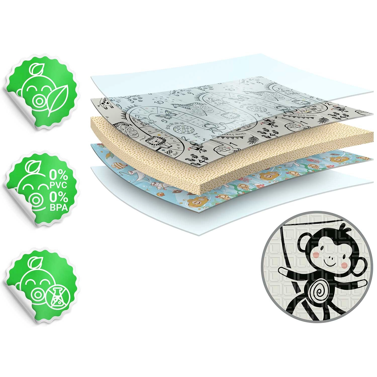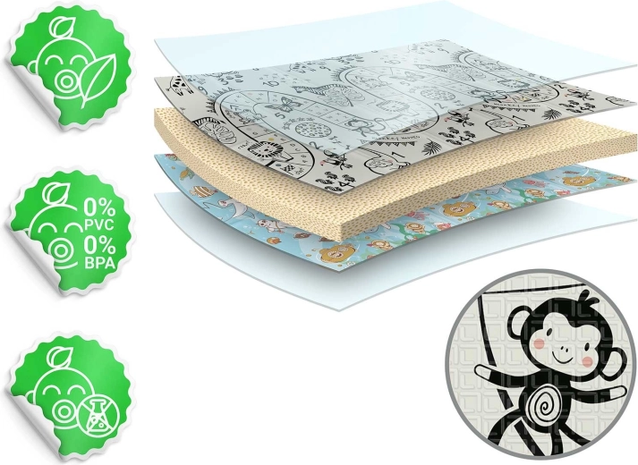 Az 1 cm vastagság kiválóan csillapítja az eséseket és szigetel a hidegtől. Az anyag szagtalan, nem tartalmaz BPA-t, PVC-t, ftalátokat és formamidot. Könnyen karbantartható – elég letörölni.