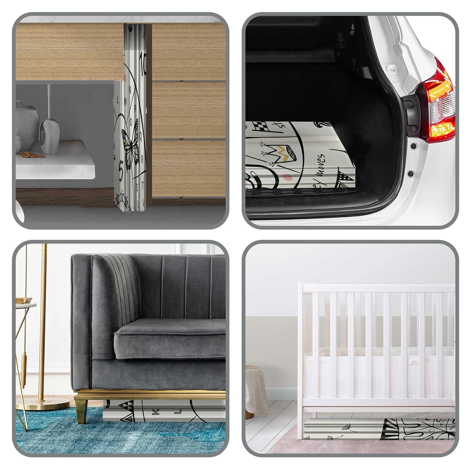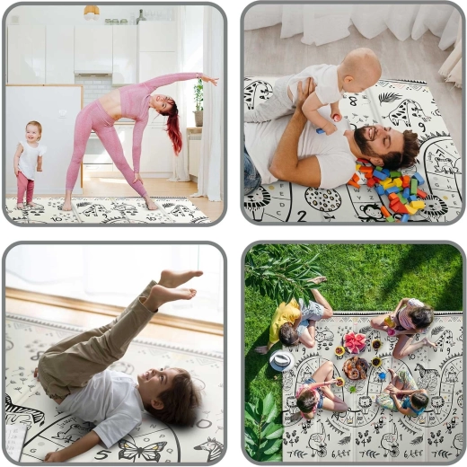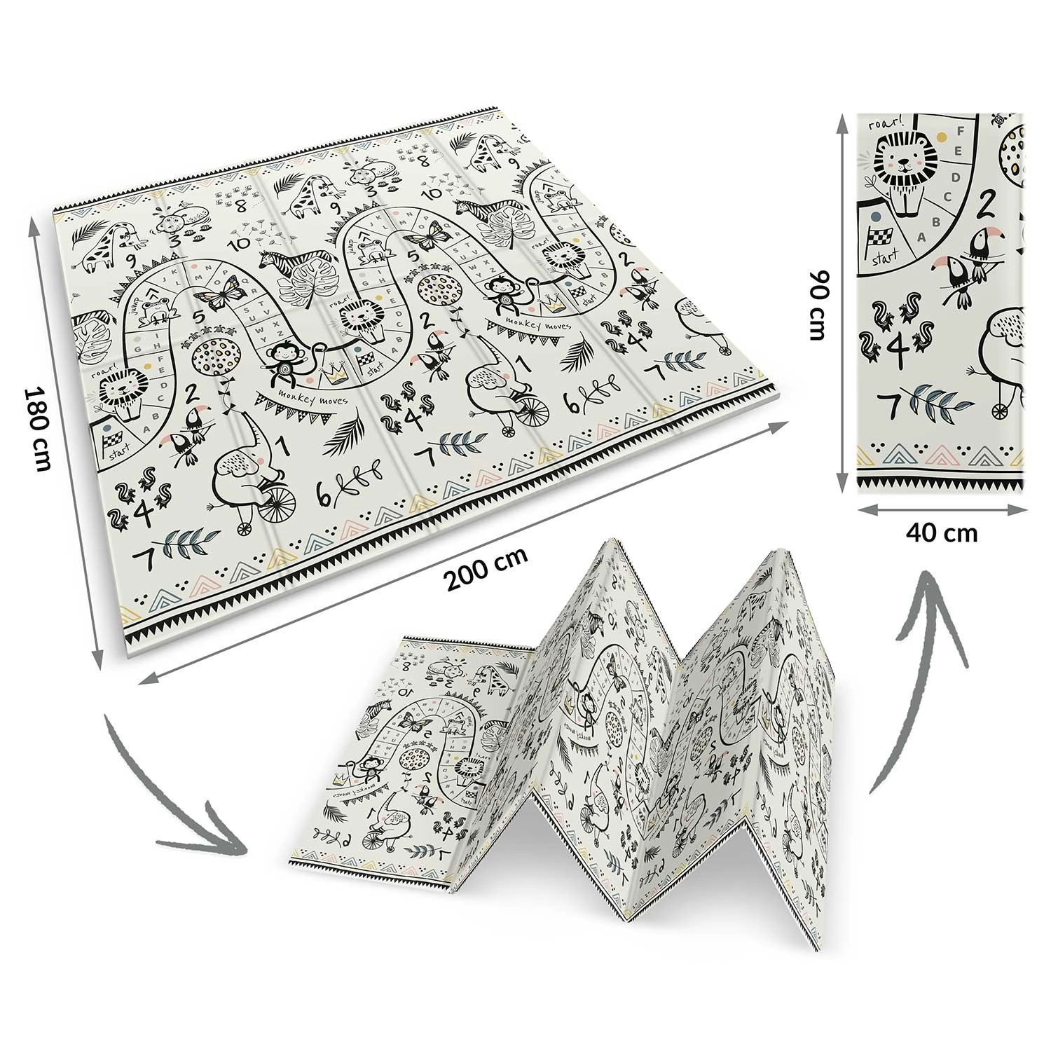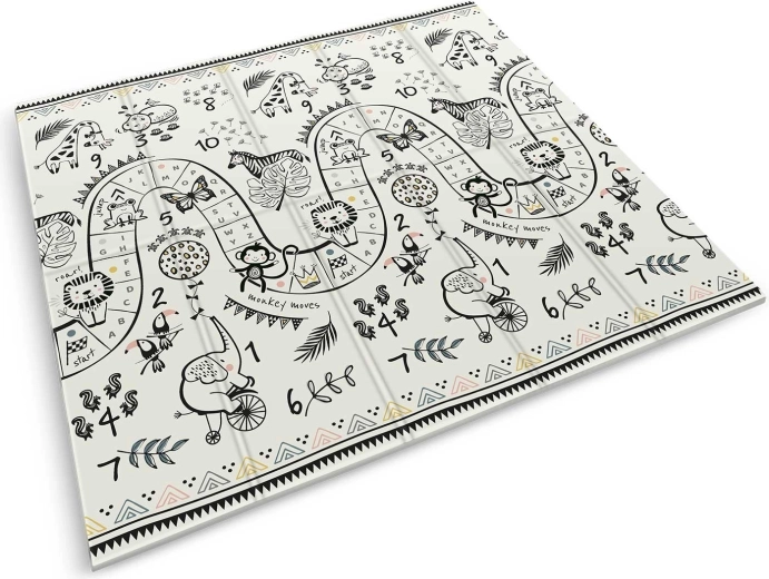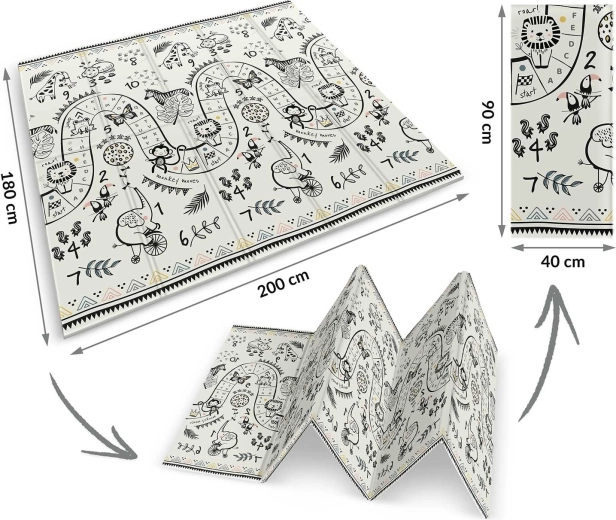 A szőnyeg harmonikaszerűen hajtható, így könnyen áthelyezhető, ágy alá vagy autóba tehető, és magaddal viheted látogatóba, játszóházba vagy piknikre. A minőségi forró préselés növeli az élettartamot, a szélek nem szakadnak, az anyag szagtalan és allergénmentes.