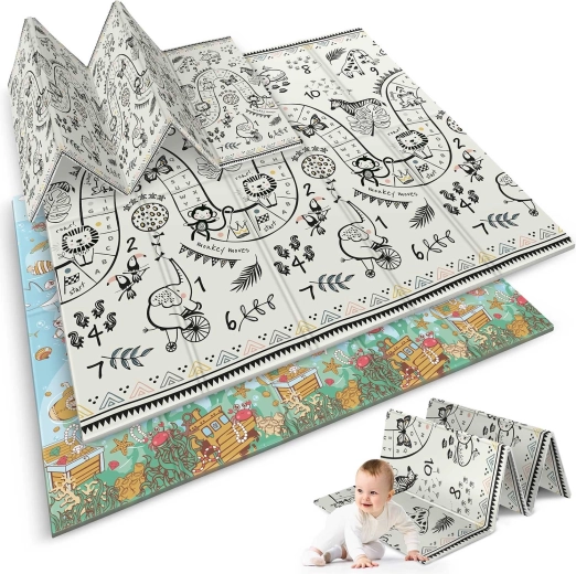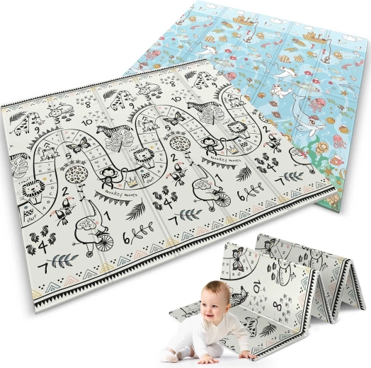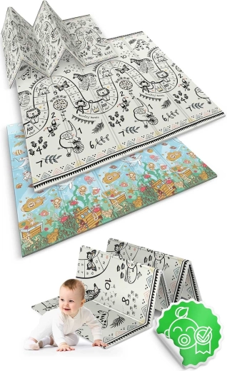 A NUKIDO összecsukható habszőnyeget a legapróbb részletekig átgondolták: a vastag, 1 cm-es XPE hab hatékonyan elnyeli az ütközéseket, a finom textúrájú felület gátolja a csúszást, a kétoldalas nyomat (óceán és szafari/játéksáv számokkal) pedig támogatja a korai fejlődést, a számok tanulását és az érzékszervi stimulációt. Vízálló és mosható felületének köszönhetően pillanatok alatt tisztítható.