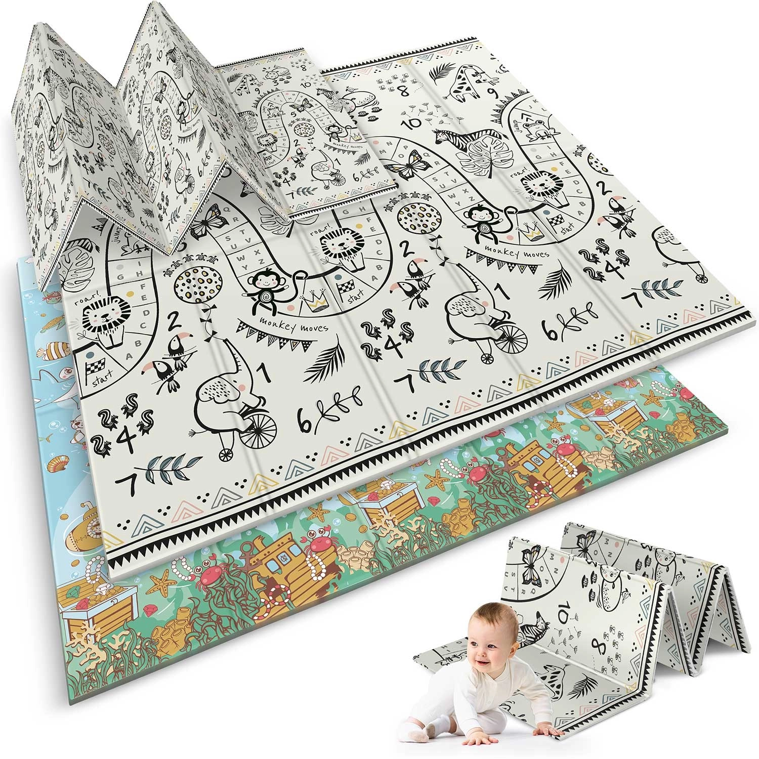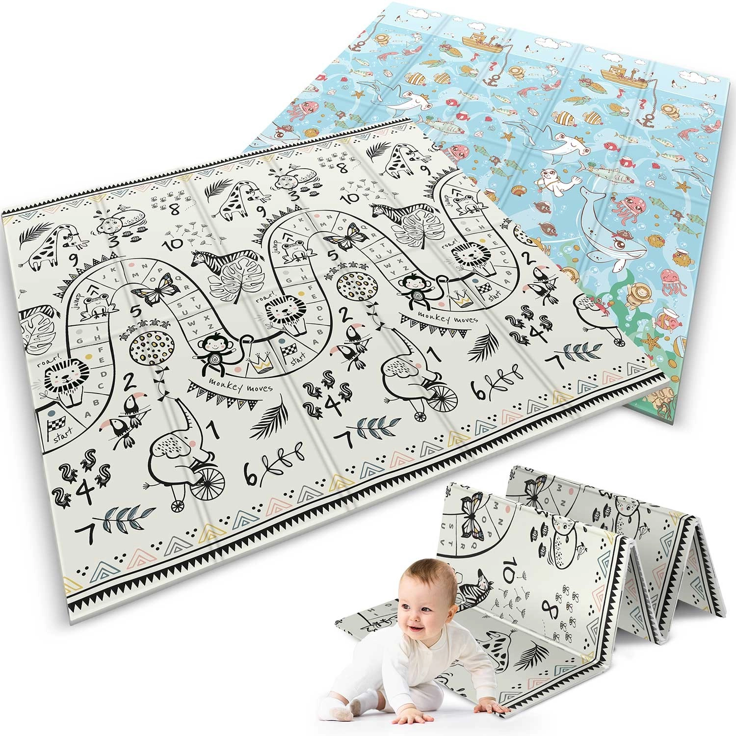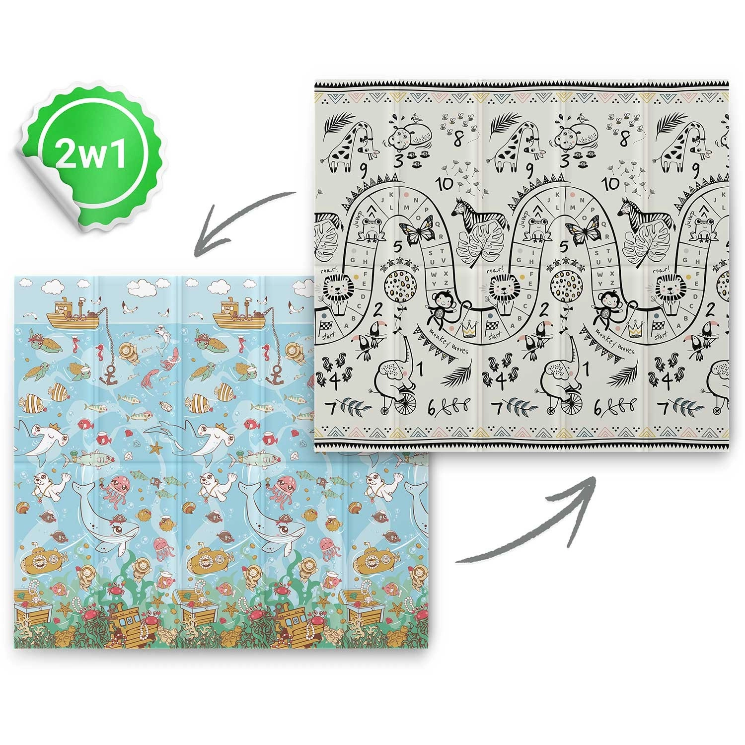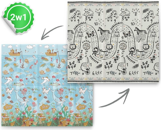 - 2 az 1-ben dizájn: kétoldalas nyomat – színes óceán és fekete–fehér játéksáv állatokkal és számokkal.