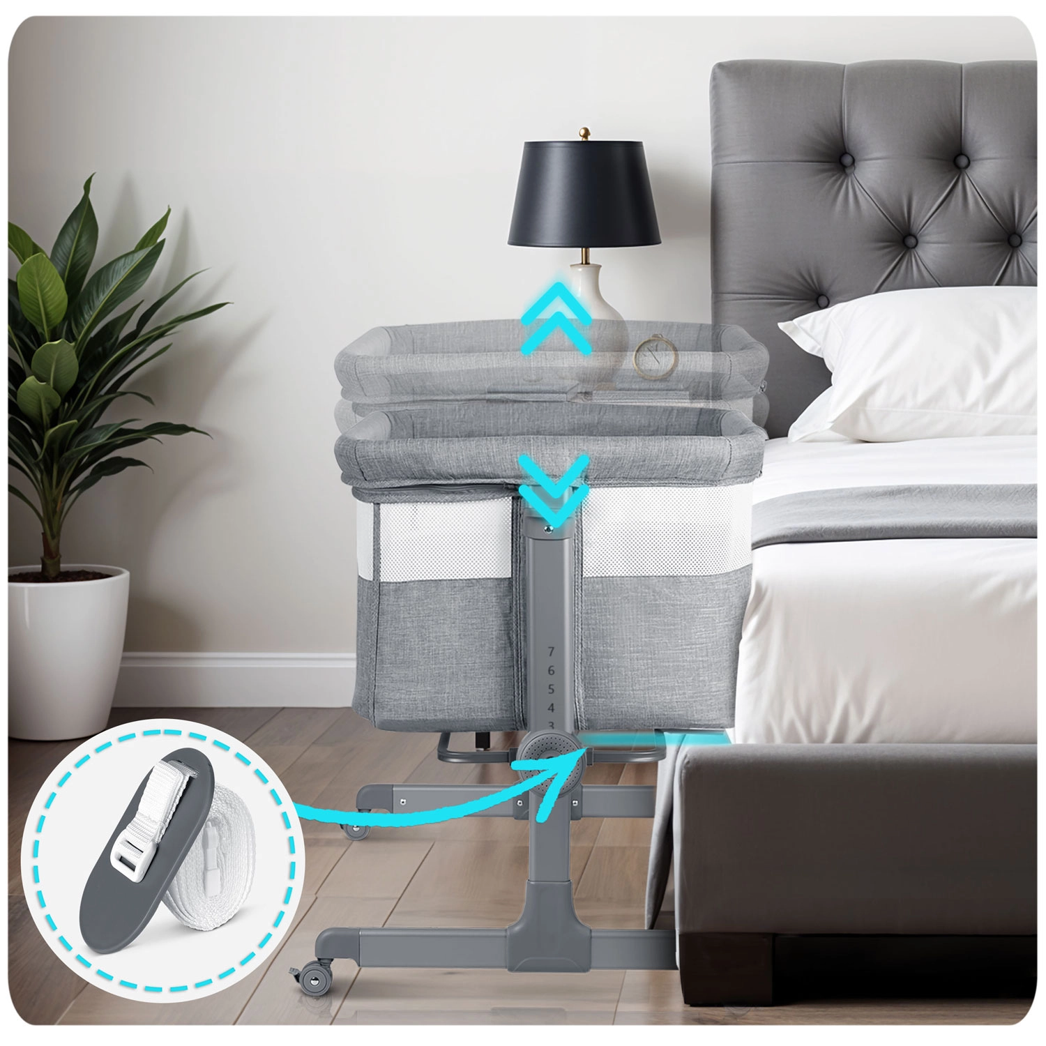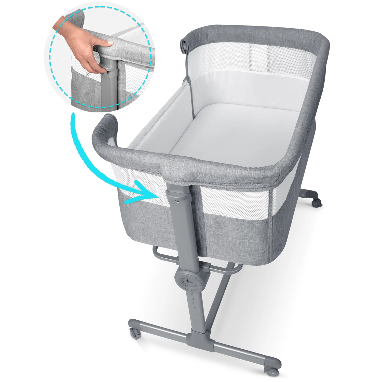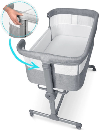 Könnyedén beállíthatja mindkét oldal magasságát külön-külön. Igazítsa a szülői ágy magasságához, vagy hozzon létre enyhe lejtést, amely hasznos lehet például reflux esetén.