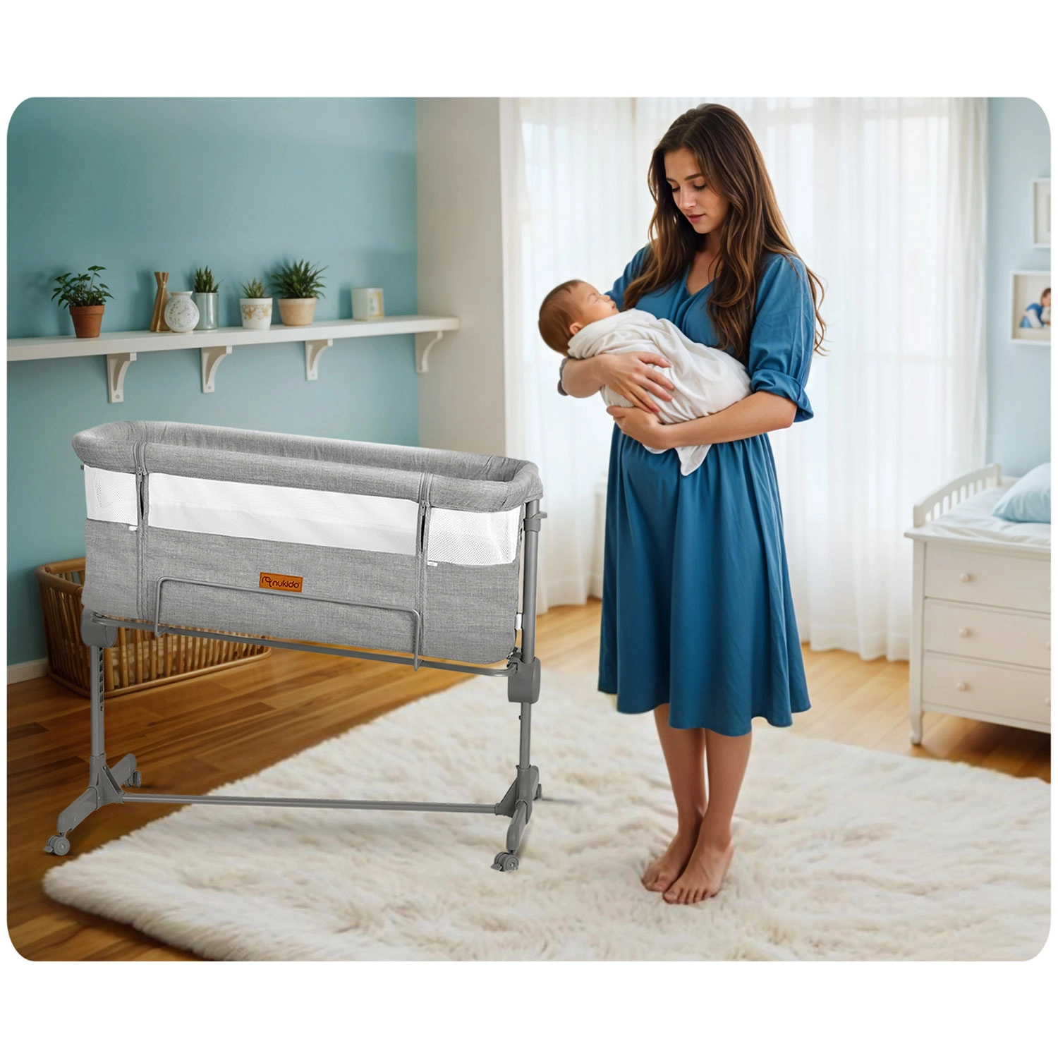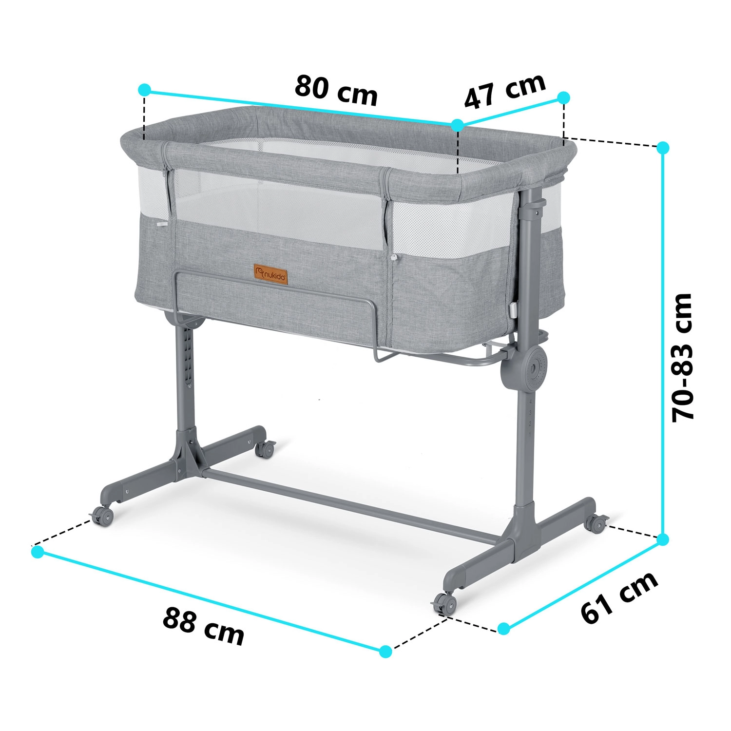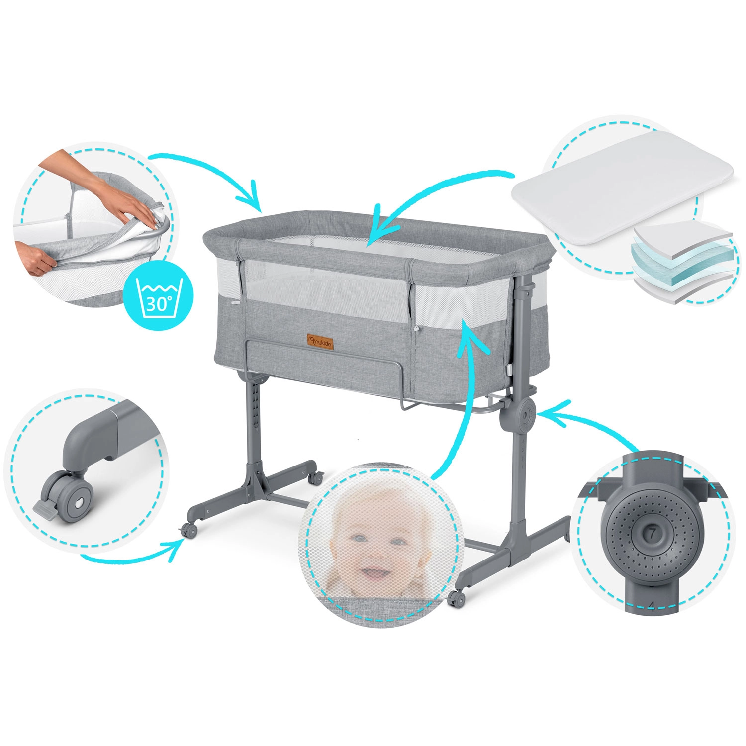 A független, kétoldali magasságállításnak köszönhetően egyszerűen a szülői ágyhoz igazíthatja a magasságot, vagy enyhe dőlést alakíthat ki, ami segíthet reflux esetén. Az összecsukható kialakítás, a könnyen levehető és mosható huzat, valamint a fékezhető kerekek a NUKIDO-t praktikus segítőtárssá teszik kisebb hálószobákba és utazáshoz is.