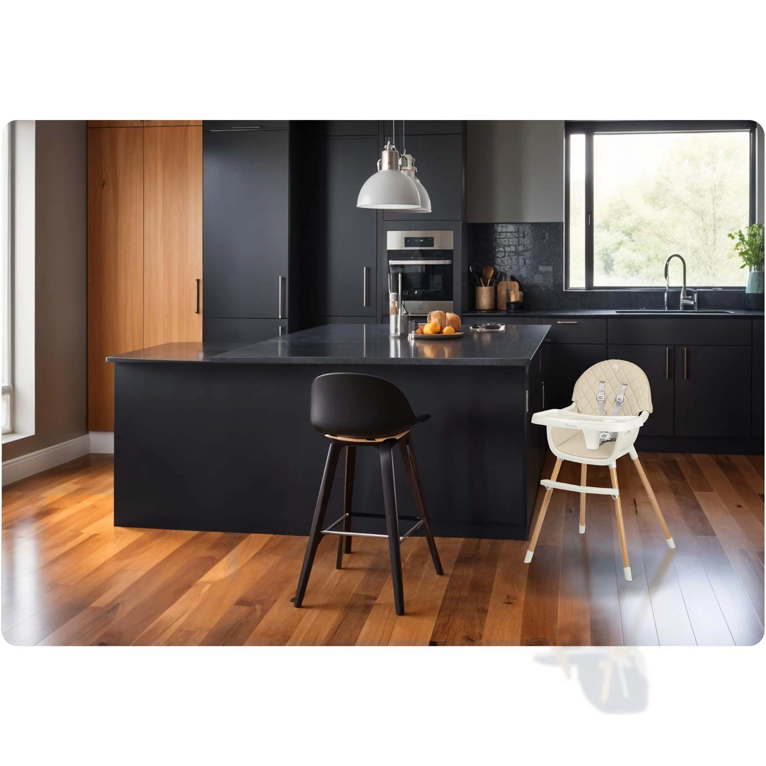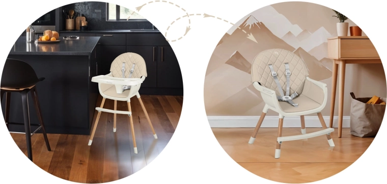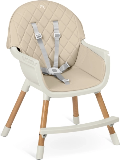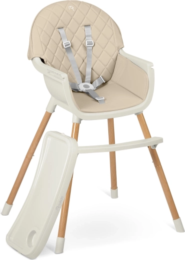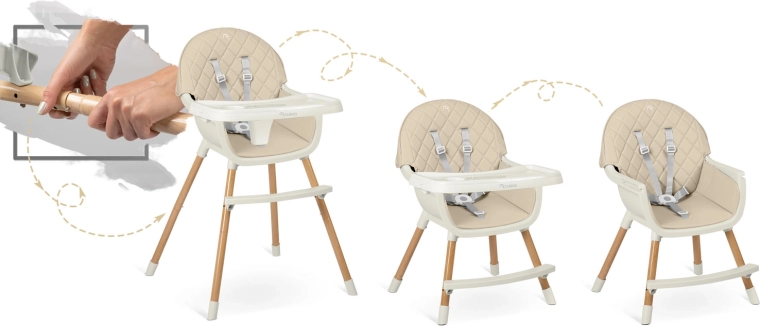 A 2 fokozatban állítható tálcának köszönhetően a távolság az életkorhoz és a gyermek igényeihez igazítható, illetve a tálca bármikor teljesen eltávolítható, hogy a gyermek közelebb ülhessen az asztalhoz. Az 5 pontos öv megfelel a szigorú európai EN 14988 szabványnak, és később leszerelhető. A lábakon lévő csúszásgátló végek különböző padlótípusokon is stabilan tartják a széket.