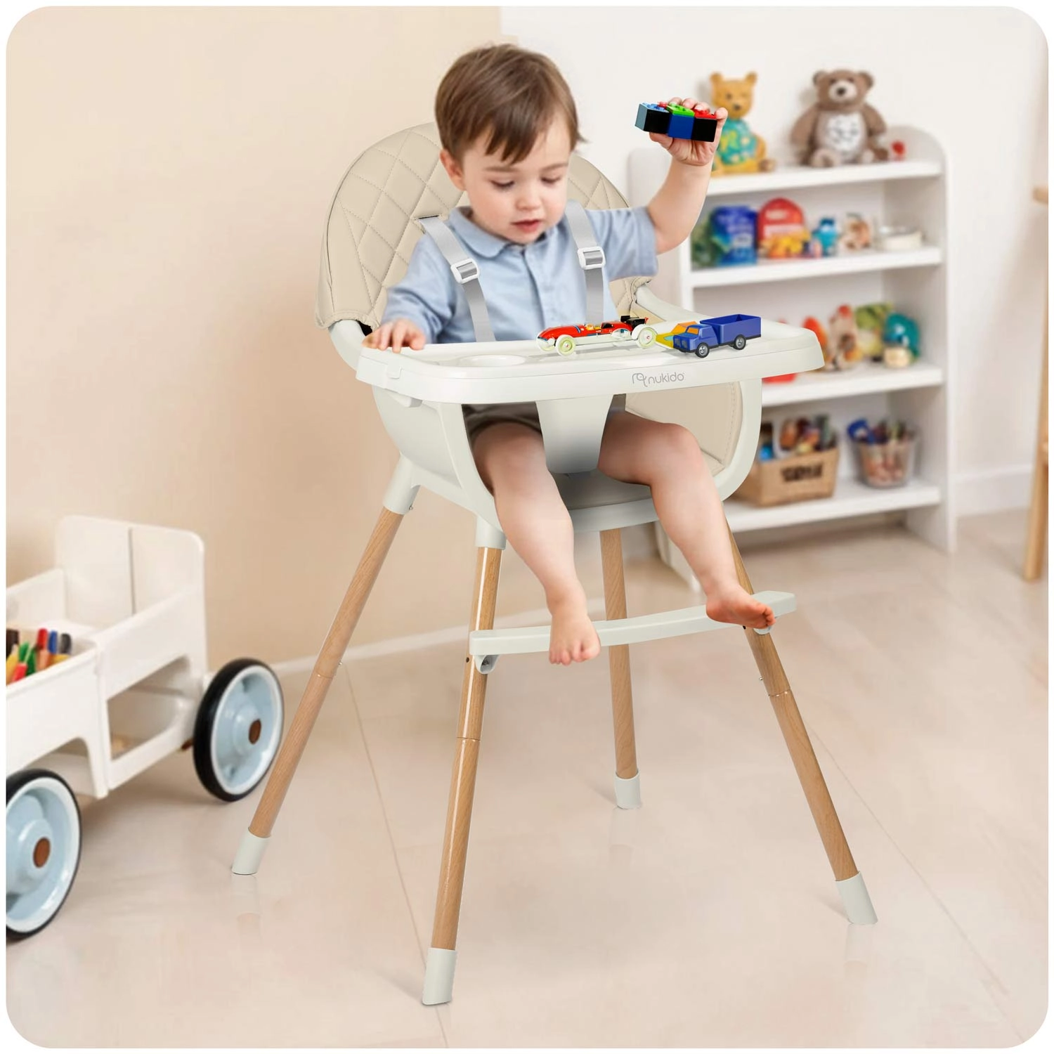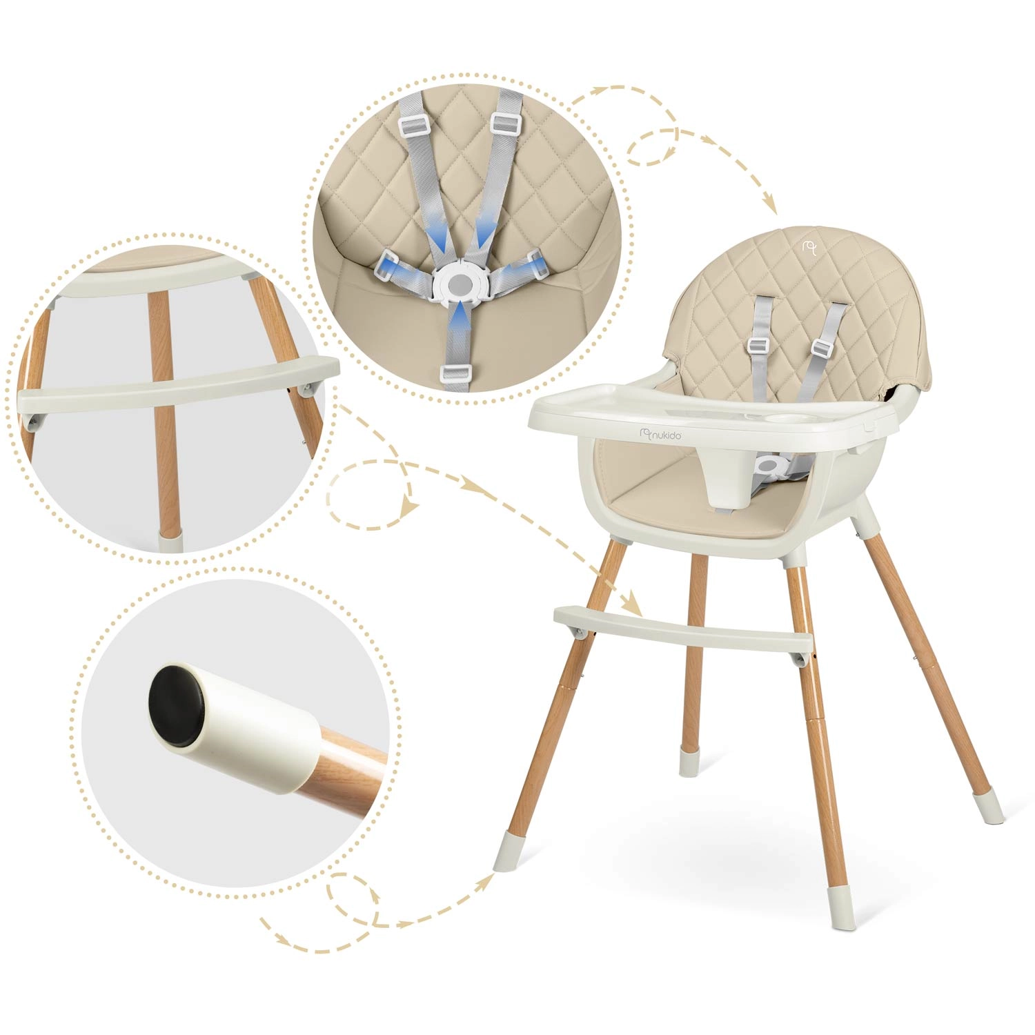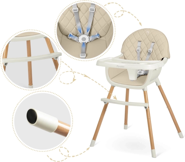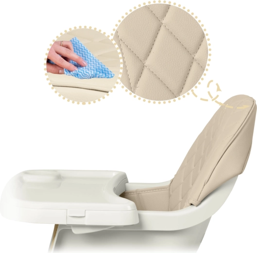 Stílusos és biztonságos NUKIDO Lilo etetőszék bézs színben, amely ötvözi a kényelmet, a stabilitást és a könnyű karbantartást. Levehető és állítható tálcával megemelt peremmel, 5 pontos biztonsági övvel, stabil lábakkal csúszásgátló végekkel és kényelmes párnázással, amely nem szívja magába a szennyeződéseket. Ideális etetéshez, játékhoz és tanuláshoz.