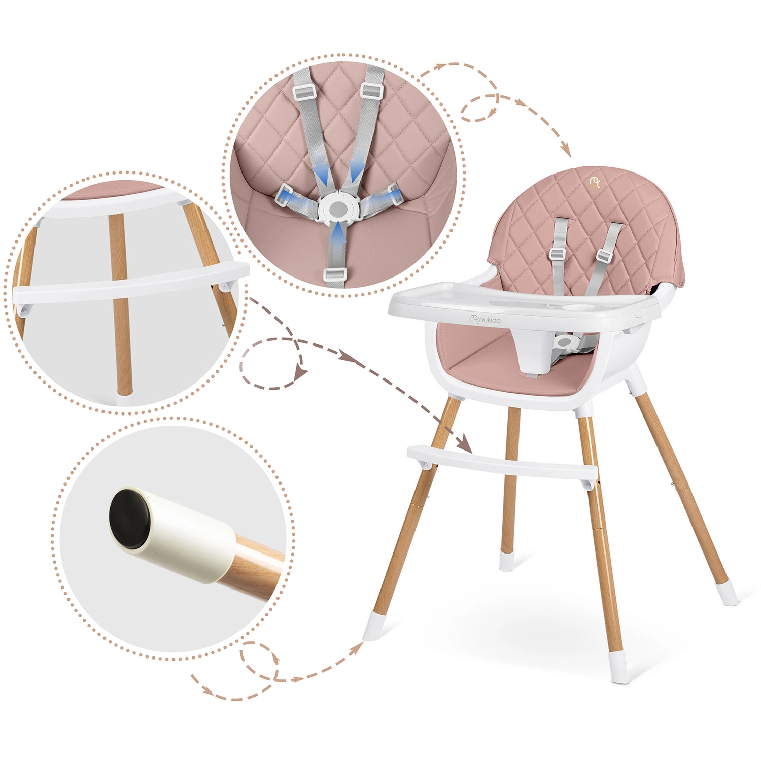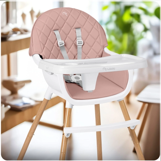 A biztonságról 5 pontos övek, fautánzatú felületű stabil acéllábak és csúszásgátló végek gondoskodnak. A szék megfelel a szigorú európai EN 14988 szabványnak. Nemcsak etetéshez ideális, hanem játékhoz, rajzoláshoz és olvasáshoz is – a gyermek kényelmesen és helyes testtartással ül.