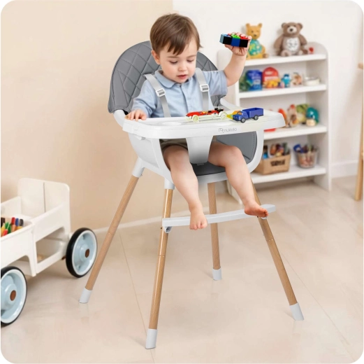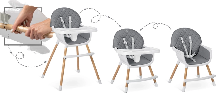 Az állítható és levehető tálca, a masszív lábtartó és a stabil felépítés lehetővé teszi a magas etetőszék vagy az alacsonyabb kisfotel használatát is. Ideális etetéshez, rajzoláshoz, építőkockázáshoz és olvasáshoz.