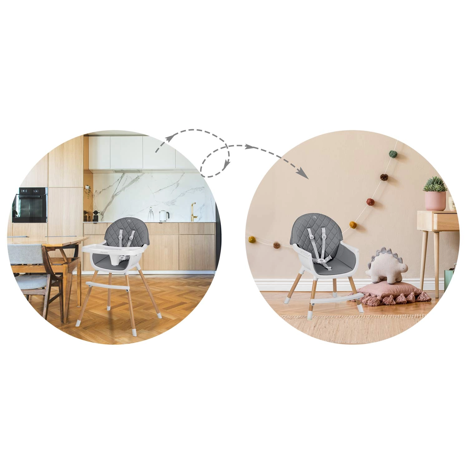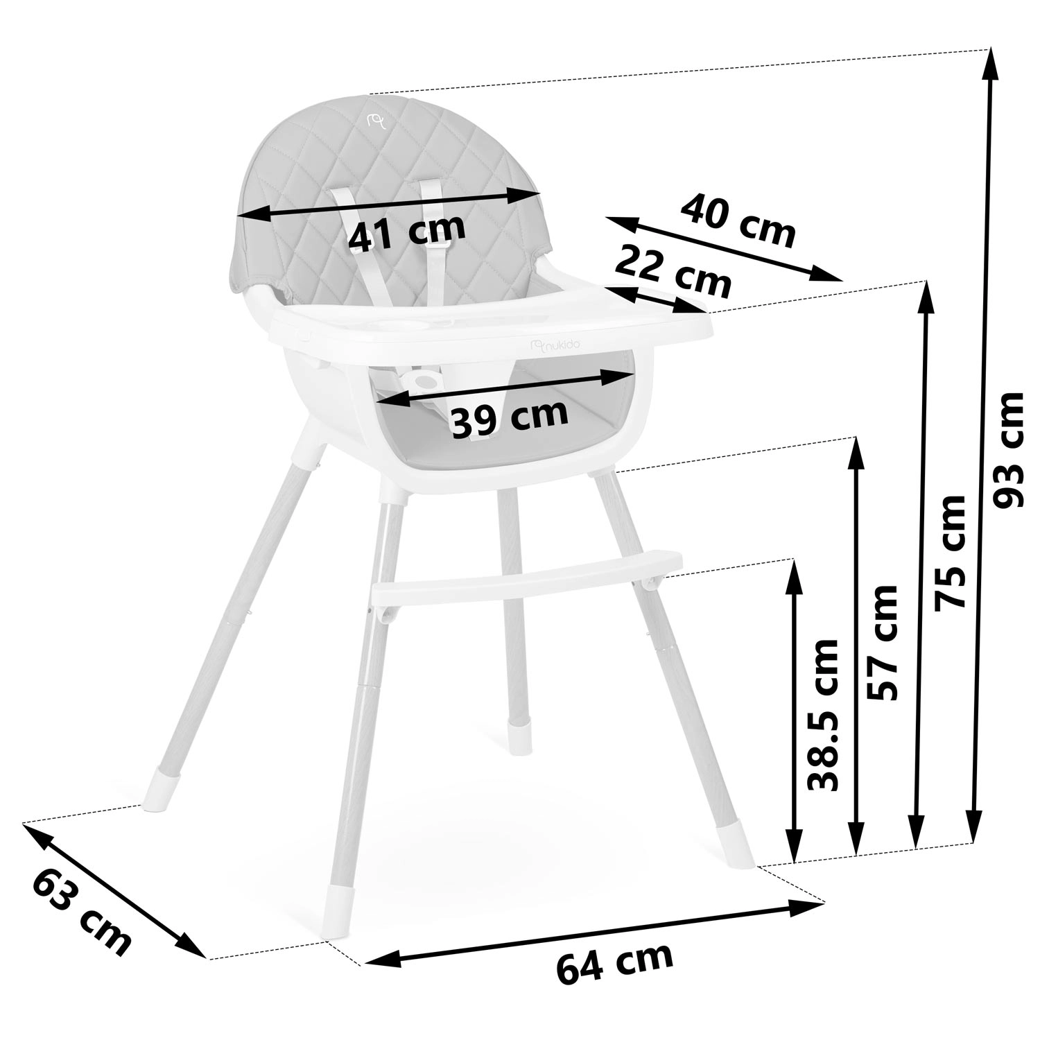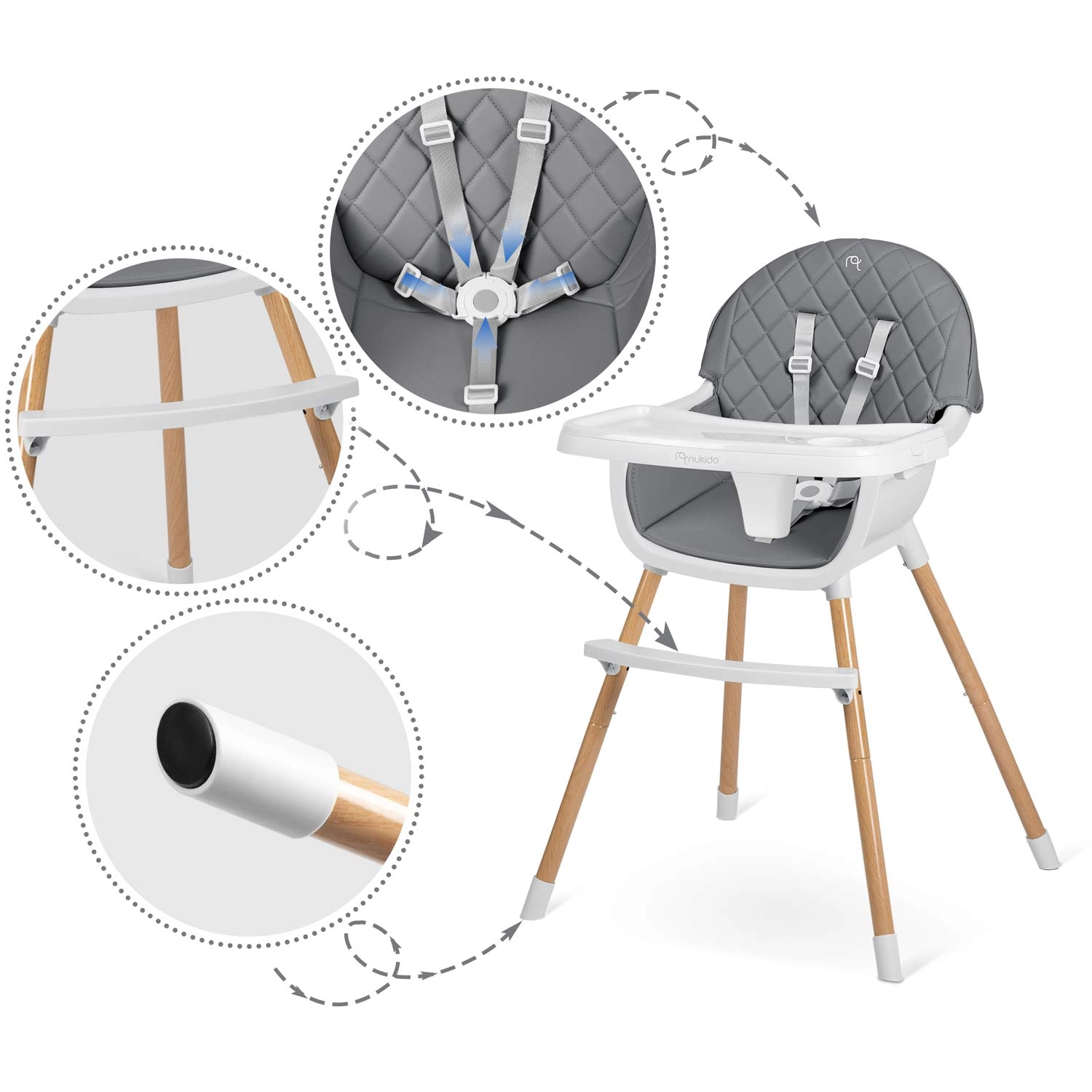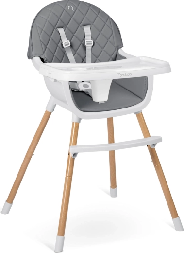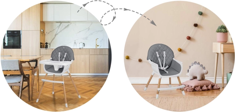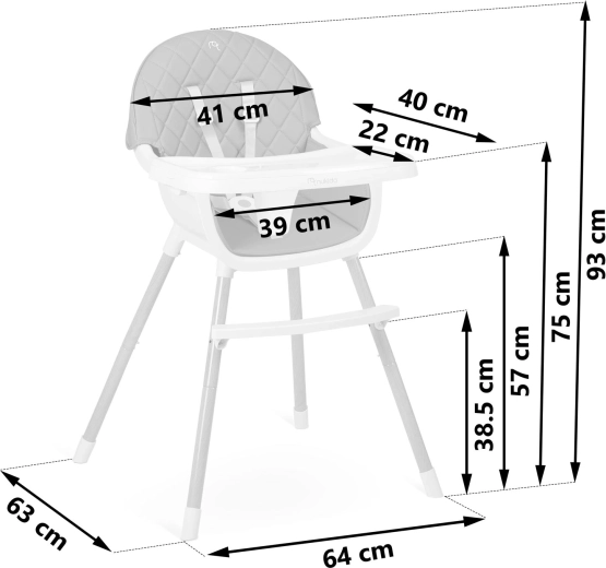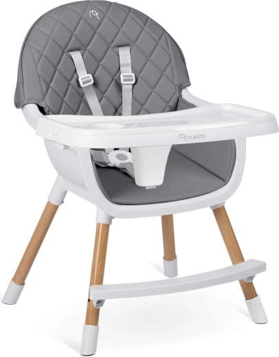A NUKIDO Lilo együtt nő gyermekével – a 3 az 1-ben funkció lehetővé teszi magas etetőszékként, kényelmes alacsony székként, illetve önálló ülőhelyként való használatát játékhoz és tanuláshoz. Az ergonomikus forma és a háttámla támogatják a helyes testtartást, míg a masszív lábtartó növeli a kényelmet étkezés és tevékenységek közben.