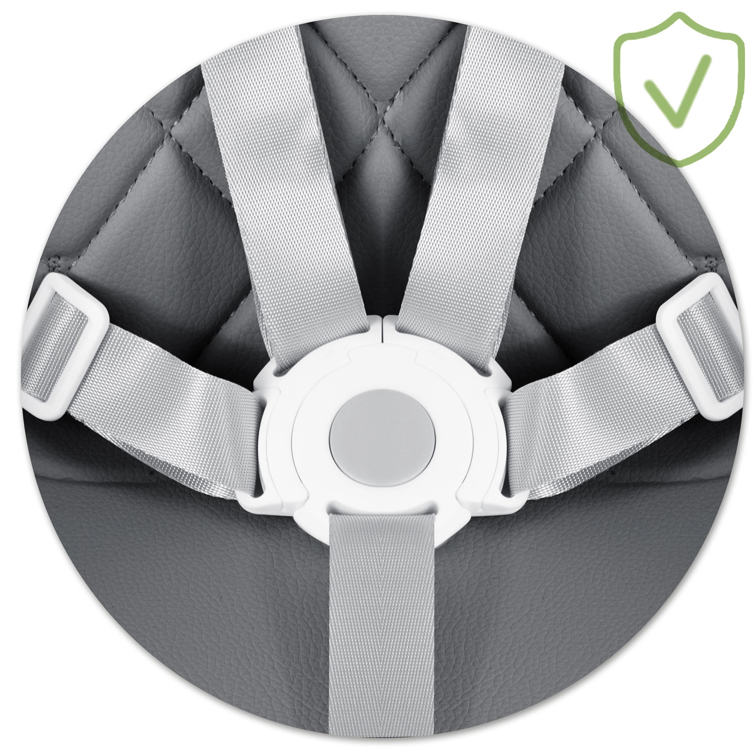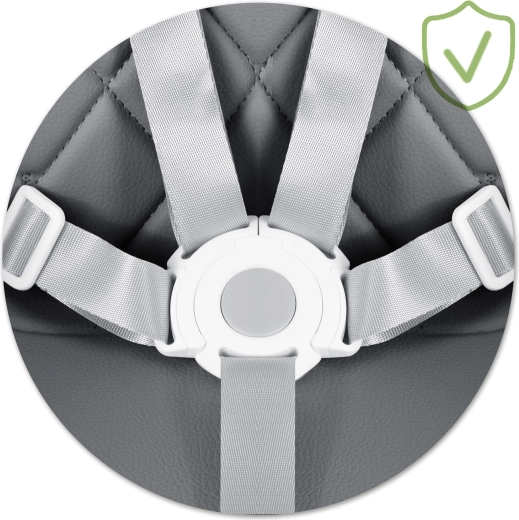 Az integrált 5 pontos övek biztonságosan és kényelmesen rögzítik a gyermeket a székben, megakadályozva a kicsúszást. A szék megfelel a szigorú EN 14988 európai szabványnak, így minden étkezésnél és játéknál nyugalmat biztosít.