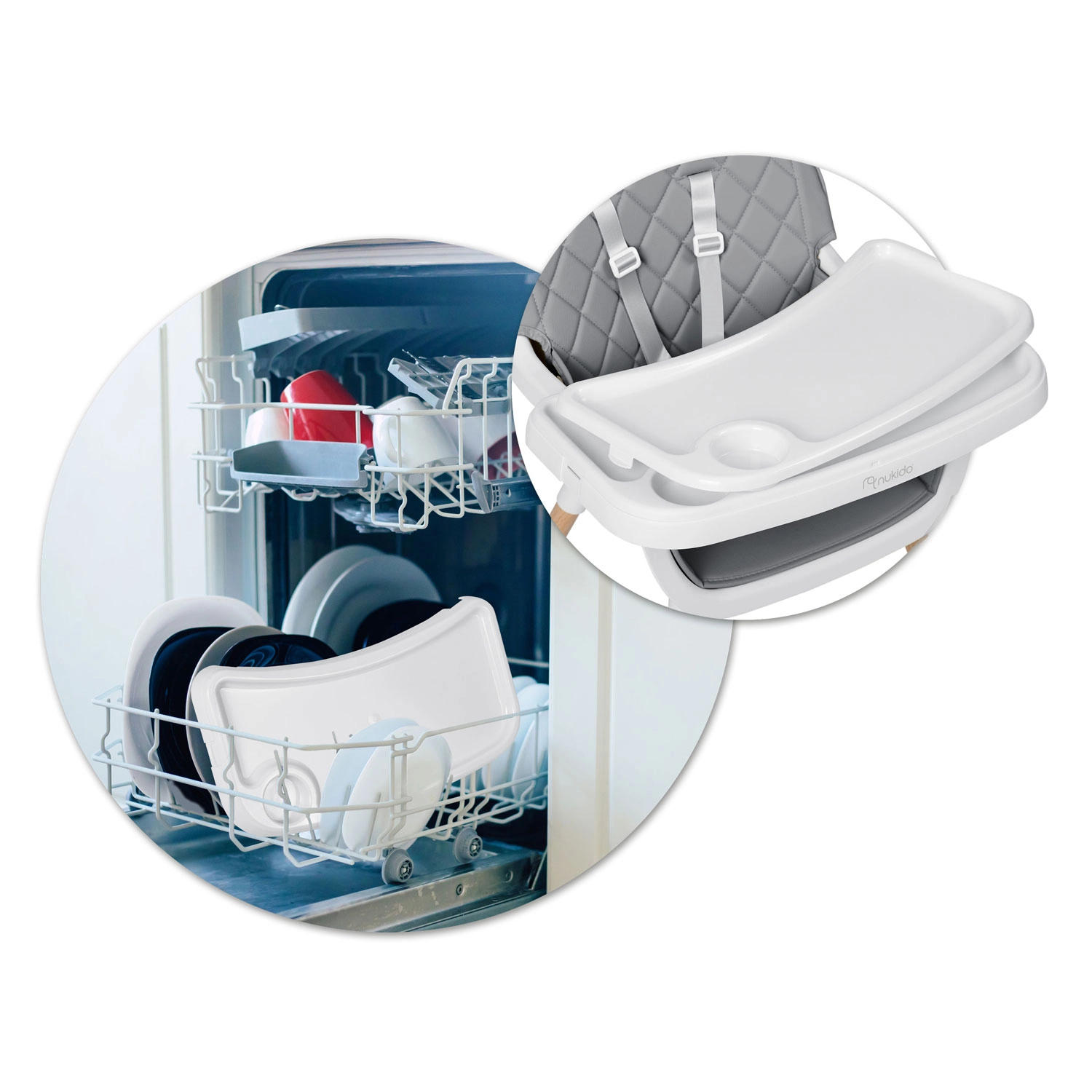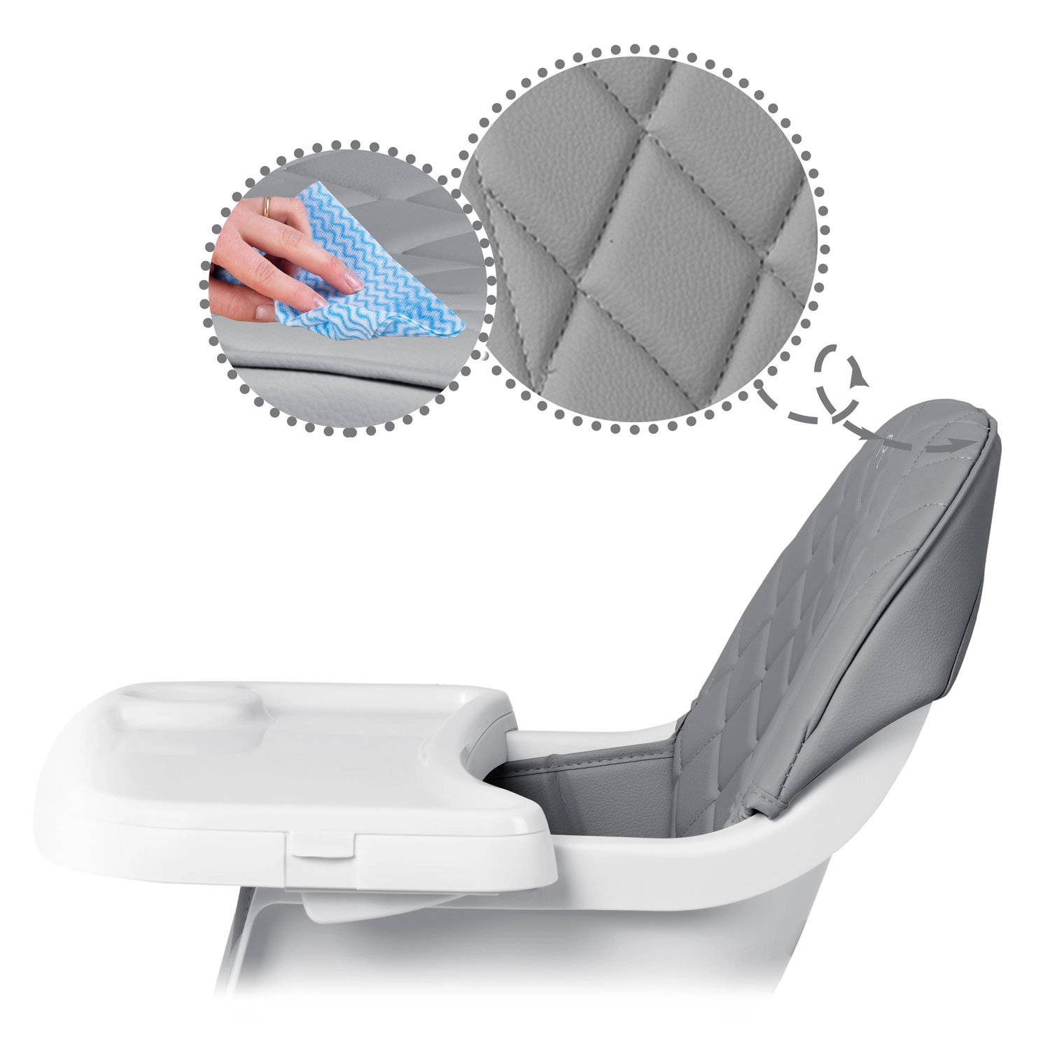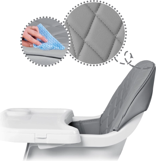 A peremes tálca külön felső betéttel felfogja a szennyeződéseket. Étkezés után egyszerűen vegye le és öblítse le, vagy tegye a mosogatógépbe. A nem nedvszívó felületű huzatot elég áttörölni egy kendővel.