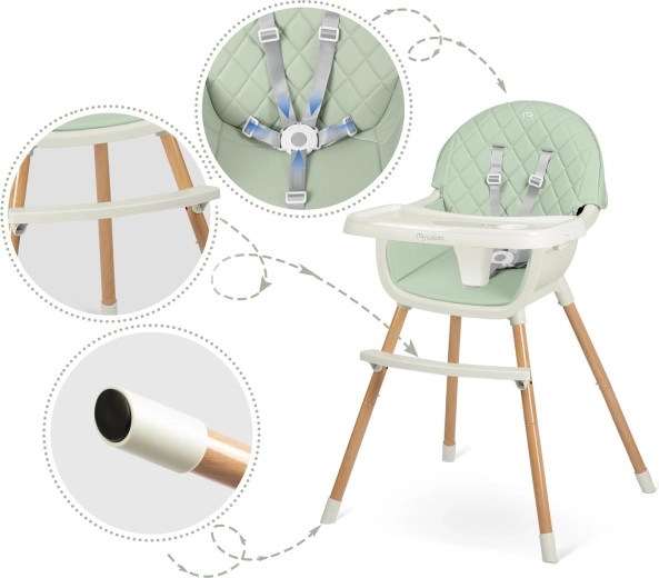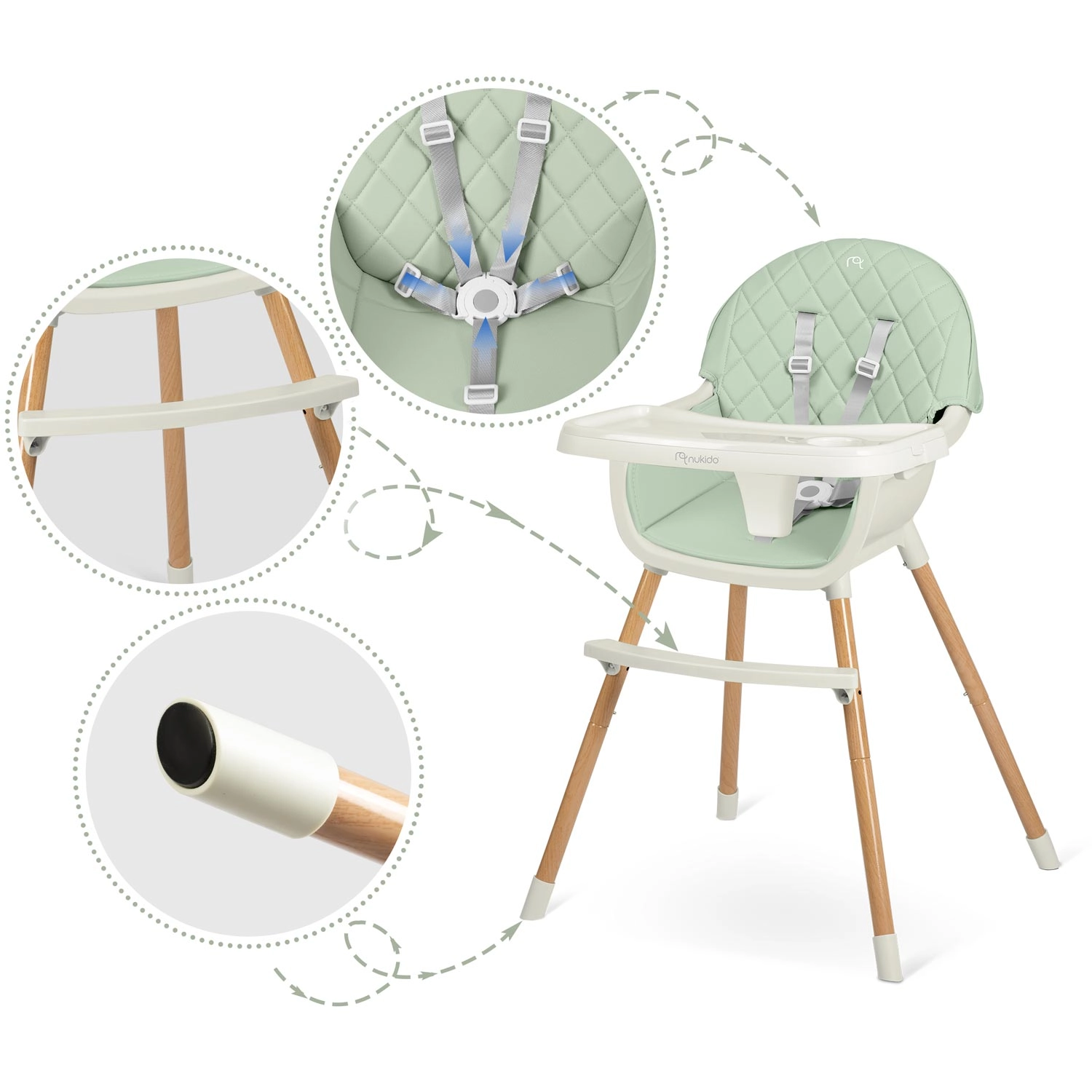 A praktikus NUKIDO Lilo 3 az 1-ben etetőszék mentazöld színben ötvözi a biztonságot, a kényelmet és a könnyű tisztíthatóságot. Kivehető tálcabetéttel, 5 pontos biztonsági övvel, stabil, csúszásgátló lábakkal és állítható lábtartóval rendelkezik. Etetéshez, játékhoz és tanuláshoz ideális – megfelel a EN 14988 szabványnak.