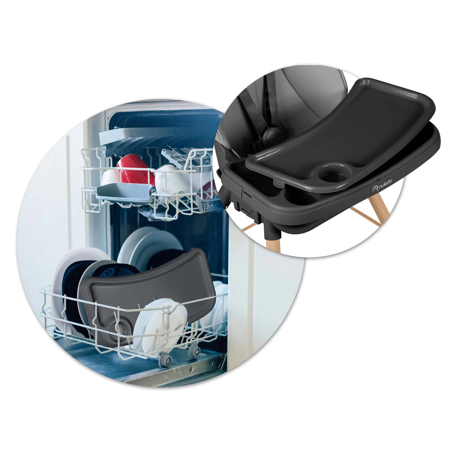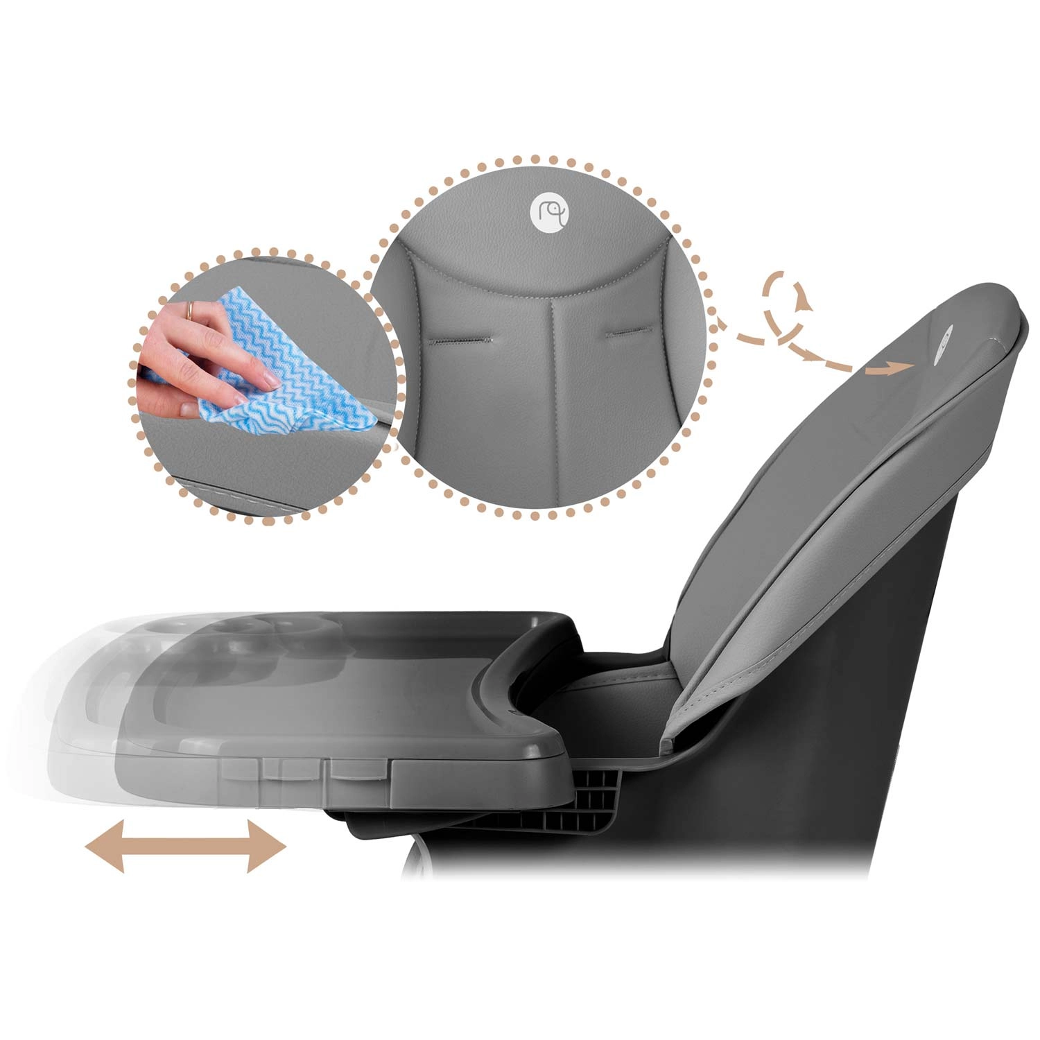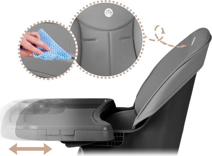 A fő tálca csúsztatható és teljesen levehető – praktikus betéttel és megemelt peremekkel a kiömlés ellen. A felületek egyszerűen nedves kendővel letörölhetők, míg a tálca és a betét mosogatógépben mosható. A maximális biztonságért 5 pontos öv és masszív lábtartó gondoskodik. A szék megfelel a szigorú európai EN 14988 szabványnak.