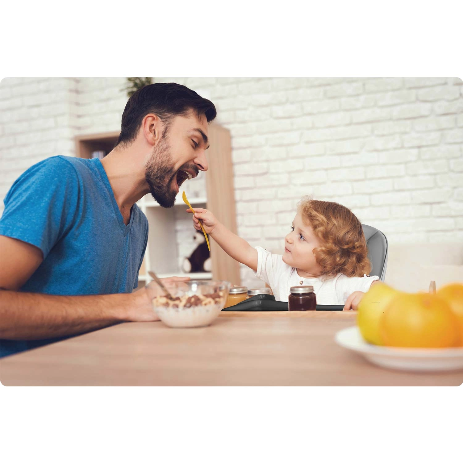 A stabil lábak csúszásgátló talpakkal, a masszív lábtartó és a megbízható 5 pontos övek biztonságban és kényelemben tartják a gyermeket étkezés és játék közben is.
